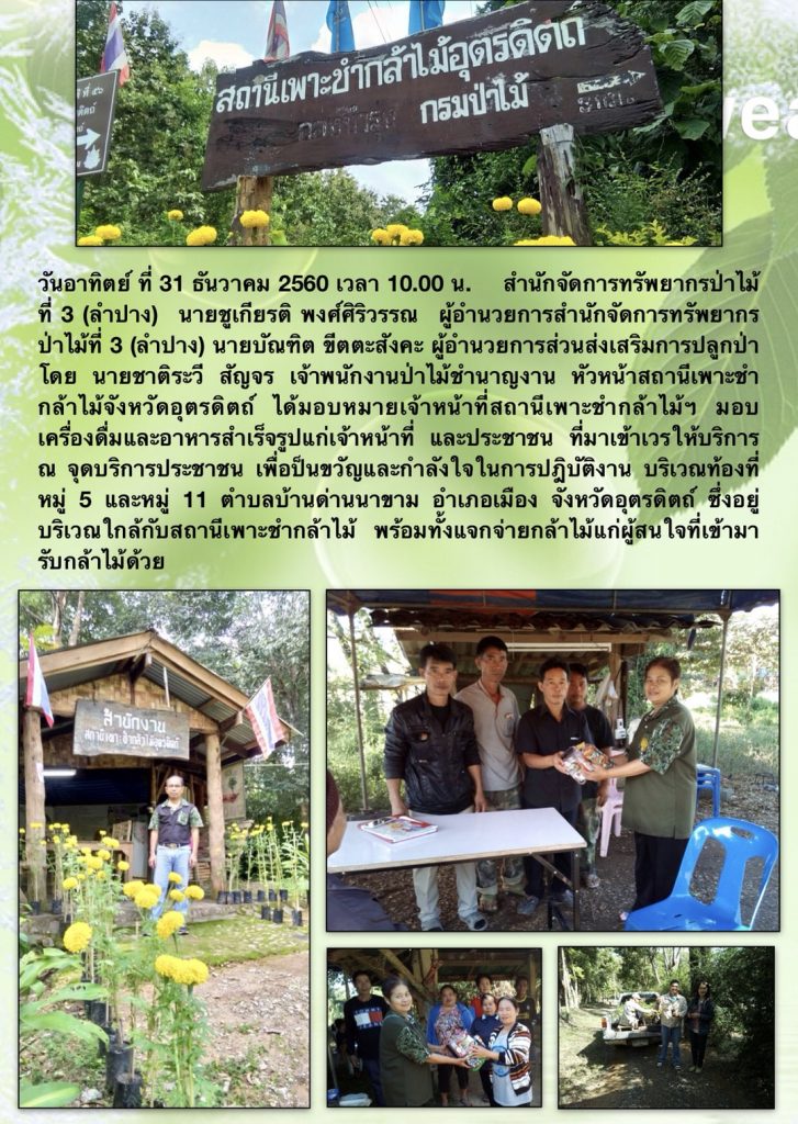 วันที่ 31 ธ.ค.60 เวลา 10.00 น. สำนักจัดการทรัพยากรป่าไม้ท่ี 3 (ลำปาง) นายชูเกียรติ พงศ์ศิริวรรณ ผอ.สำนักจัดการทรัพยากรป่าไม้ที่3 (ลำปาง) นายบัณฑิต ขีตตะสังคะ ผอ.ส่วนส่งเสริมการปลูกป่า โดยนายชาติระวี สัญจร เจ้าพนักงานป่าไม้ชำนาญงาน หัวหน้าสถานีเพาะชำกล้าไม้จังหวัดอุตรดิตถ์ ได้มอบหมายเจ้าหน้าที่สถานีมอบเครื่องดื่มและอาหารสำเร้จรูปแก่เจ้าหน้าที่ ประชาชนที่มาเข้าเวร ณจุดบริการประชาชนเพื่อเป็นขวัญและกำลังใจ บริเวณท้องที่หมู่ 5 และหมู่ 11 ตำบลบ้านด่านนาขาม อำเภอเมือง จังหวัดอุตรดิตถ์ ซึ่งอยู่บริเวณใกล้กับสถานี นายชาติระวี สัญจร หัวหน้าสถานีฯ รายงาน