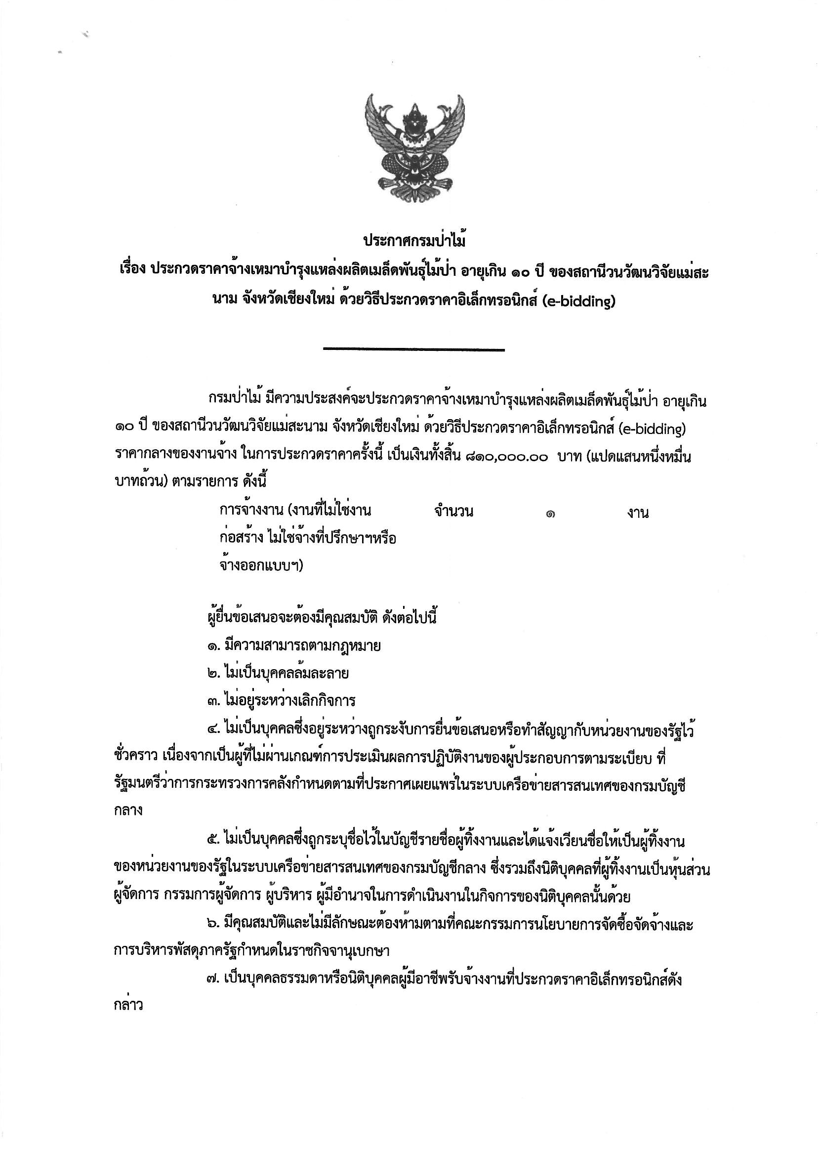 ประกาศกรมป่าไม้ เรื่อง ประกวดราคาจ้างเ หมาบำรุงแหล่งผลิตเมล็ดพันธุ์ไม้ป่า อายุเ กิน 10 ปี ของสถานีวนวัฒนวิจัยแม่สะนาม จังหว ัดเชียงใหม่ ด้วยวิธีประกวดราคาอิเล็กทรอน ิกส์ (e-bidding)