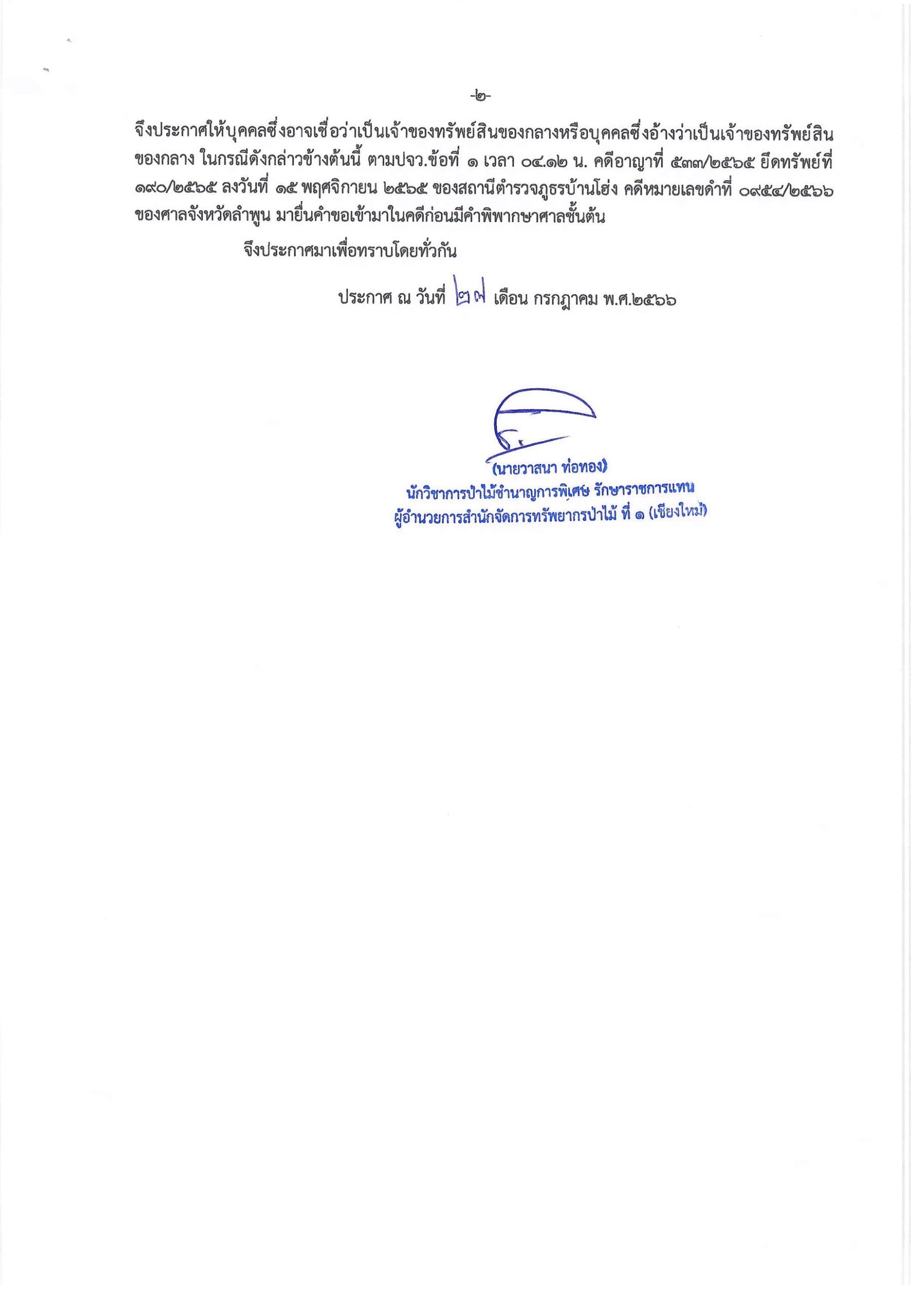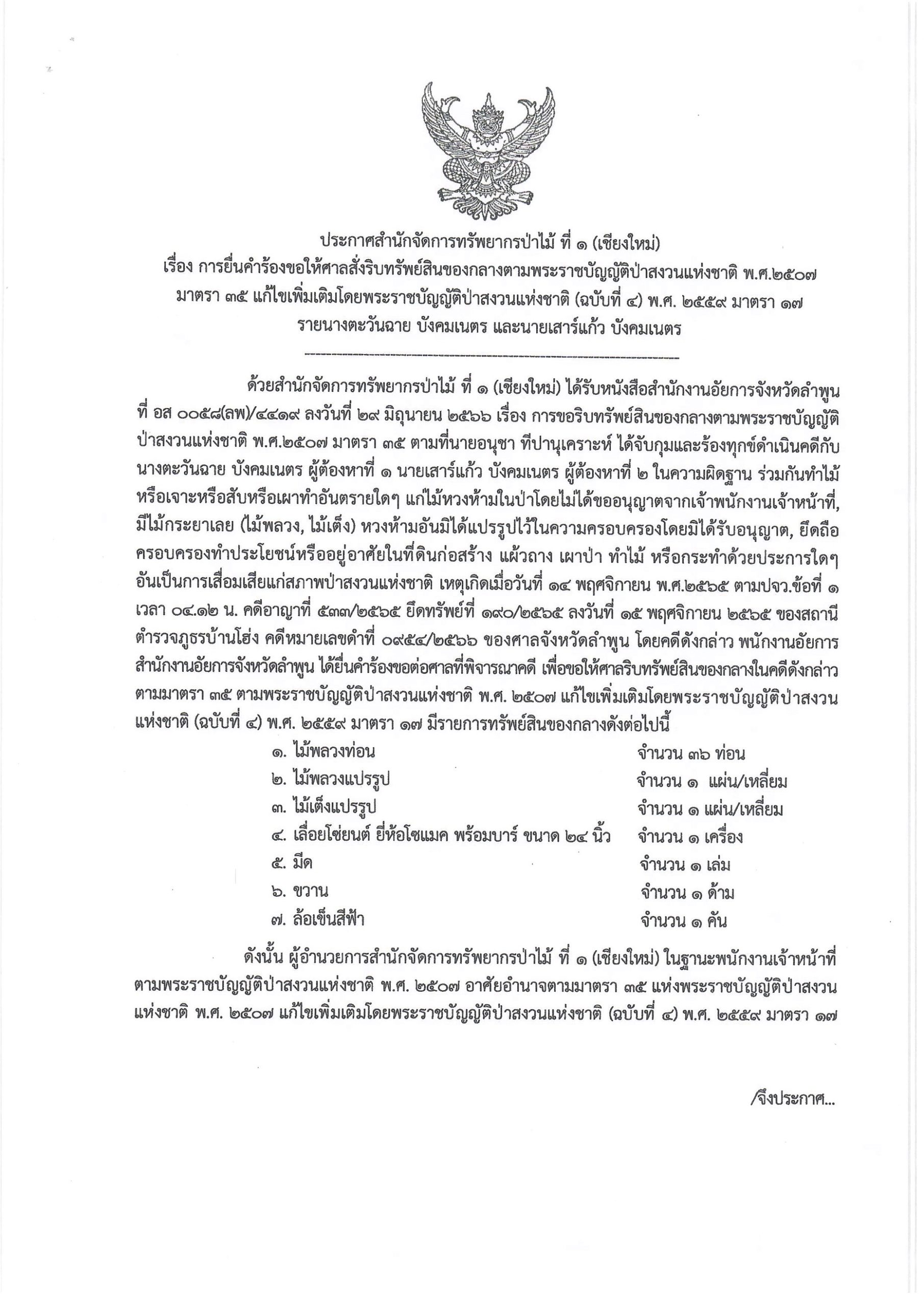 หน้าแรก » ประกาศสำนักจัดการทรัพยากรป่าไม้ ที่ ๑ ( เชียงใหม่) เรื่อง การยื่นคำร้องขอให้ศาลสั่ งริบทรัพย์สินของกลางตามพระราชบัญญัติป่าส งวนแห่งชาติ พ.ศ.๒๕๐๗มาตรา ๓๕ แก้ไขเพิ่มเติม โดยพระราชบัญญัติป่าสงวนแห่งชาติ (ฉบับที่ ๔ ) พ.ศ. ๒๕๕๘ มาตรา ๑๗รายนางตะวันฉาย บังคมเนตร และนายเสาร์แก้ว บังคมเนตร