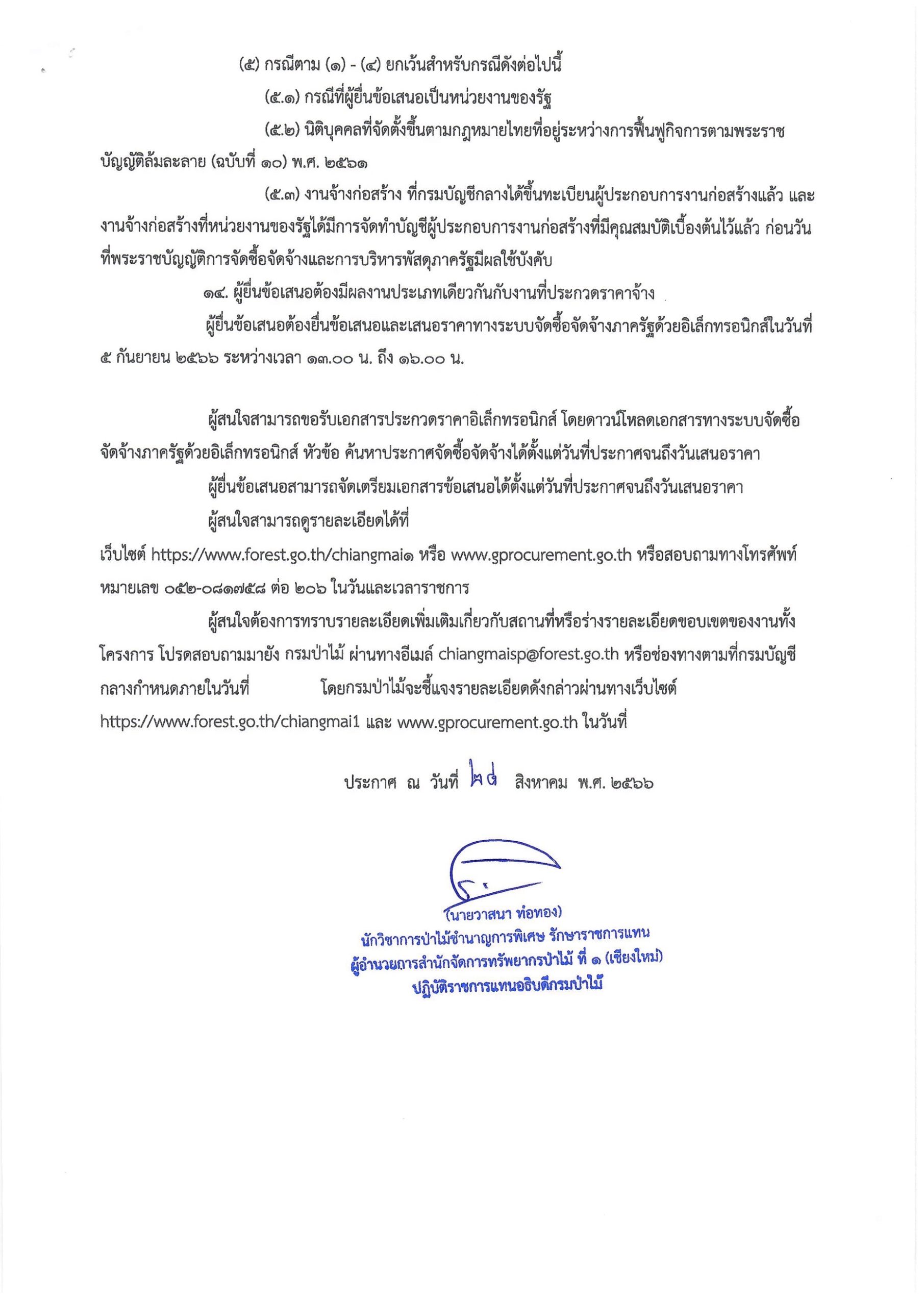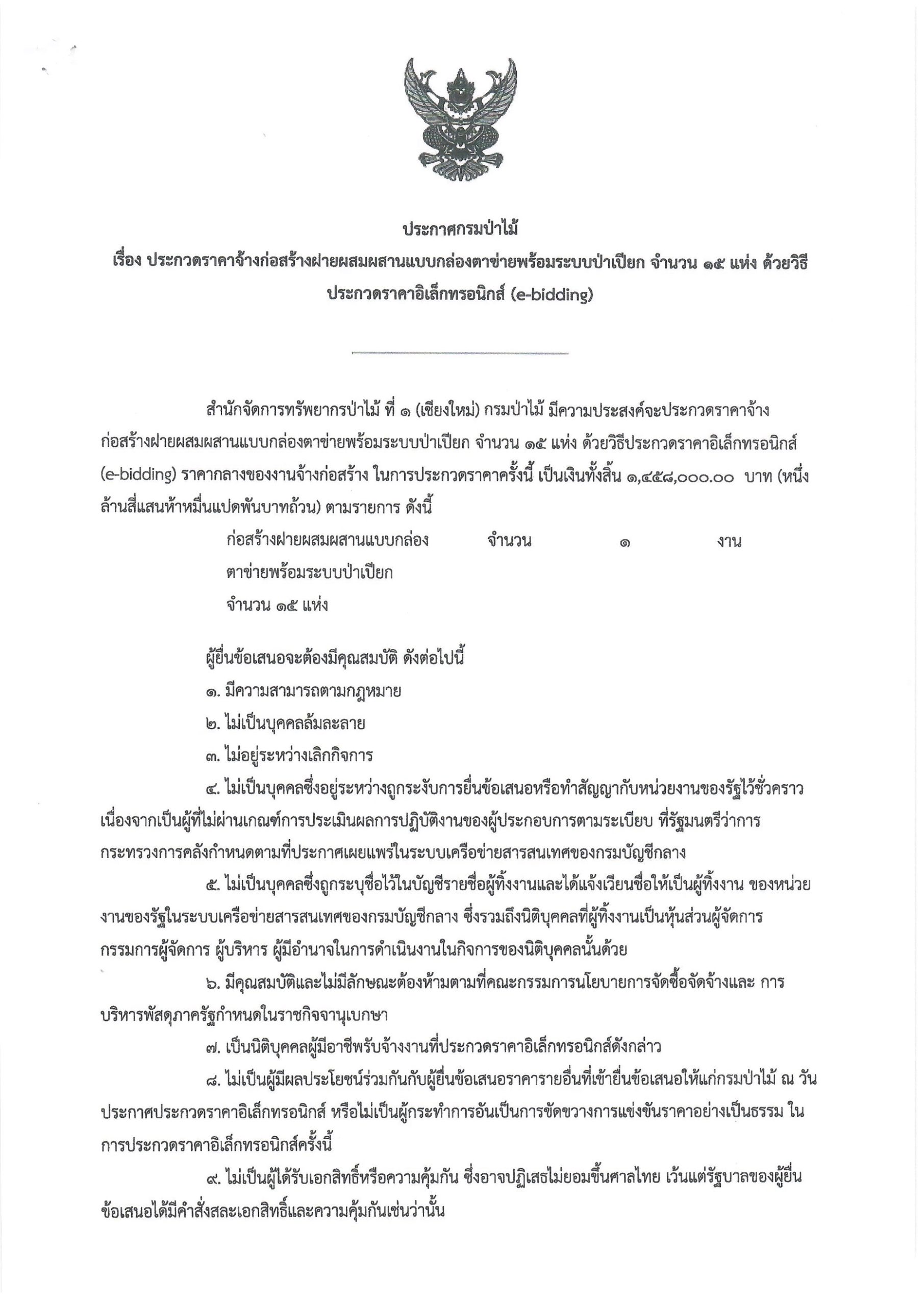 ประกาศกรมป่าไม้เรื่อง ประกวดราคาจ้างก ่อสร้างฝ่ายผสมผสานแบบกล่องตาข่ายพร้อมระบ บป่าเปียก จำนวน ๑๕ แห่ง ด้วยวิธีประกวดราคา อิเล็กทรอนิกส์ (e-bidding)