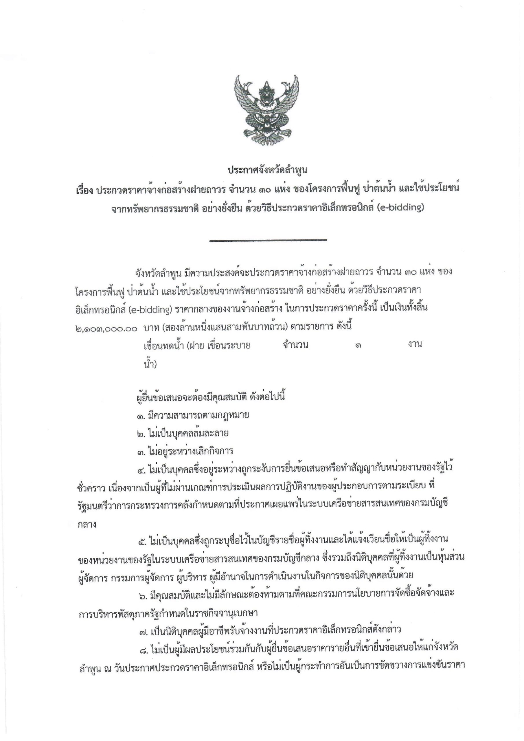 ประกาศจังหวัดลำพูน เรื่อง ประกวดราคาจ้ างก่อสร้างฝายถาวร จำนวน ๓๐ แห่ง ของโครงการ ฟื้นฟู ป่าต้นน้ำ และใช้ประโยชน์จากทรัพยาก รธรรมชาติ อย่างยั่งยืน ด้วยวิธีประกวดราค าอิเล็กทรอนิกส์ (e-bidding) 5 กันยายน 2023 by mailposter แชร์สิ่งนี้:Tweet