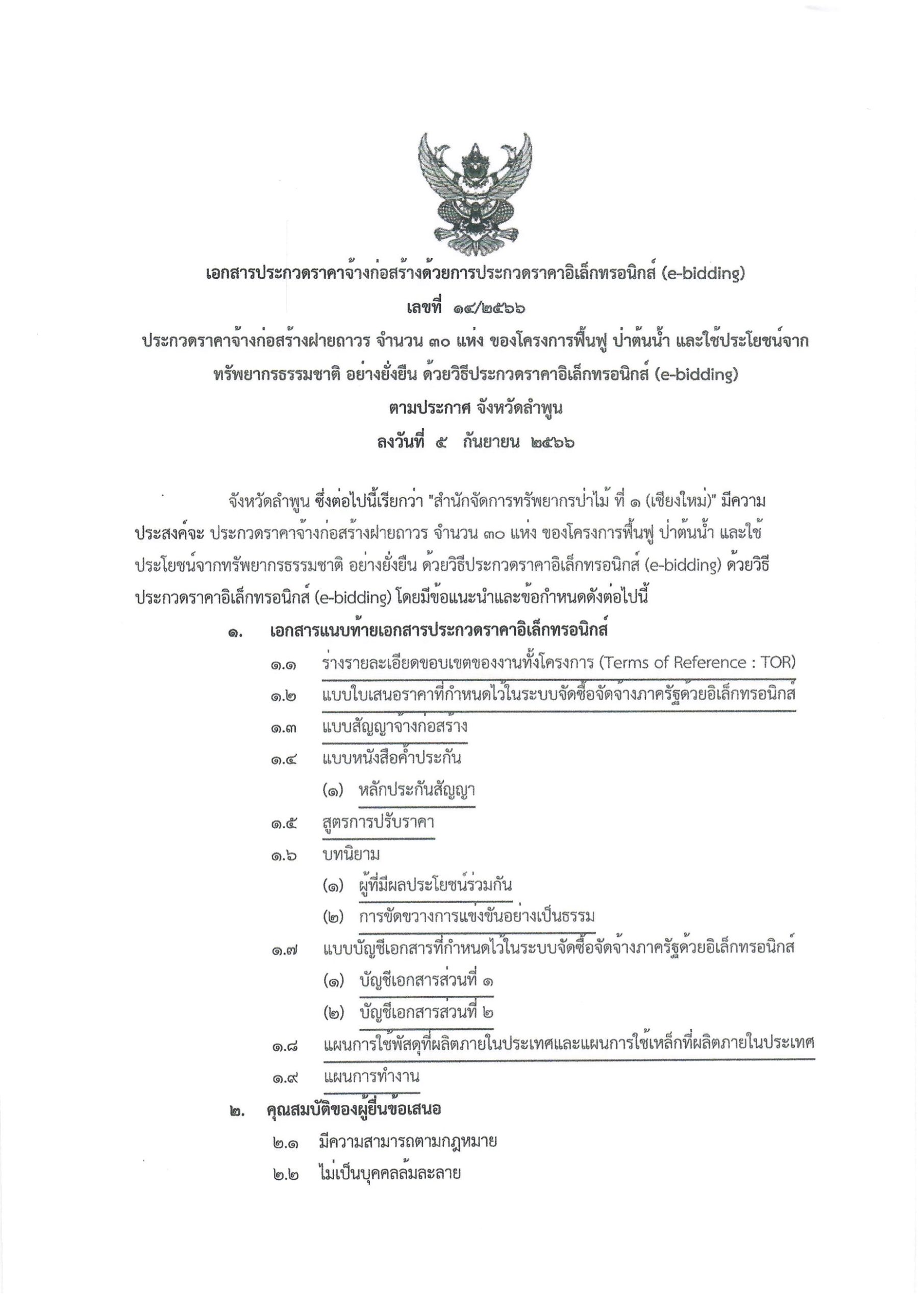 เอกสารประกวดราคาจ้างก่อสร้างด้วยการปร ะกวดราคาอิเล็กทรอนิกส์ (e-bidding) เลขที่ ๑๔/๒๕๖๖ ประกวดราคาจ้างก่อสร้างฝายถาวร จำนวน ๓๐ แห่ ง ของโครงการฟื้นฟู ป่าต้นน้ำ และใช้ประโยช น์จากทรัพยากรธรรมชาติ อย่างยั่งยืน ด้วยวิ ธีประกวดราคาอิเล็กทรอนิกส์ (e-bidding)