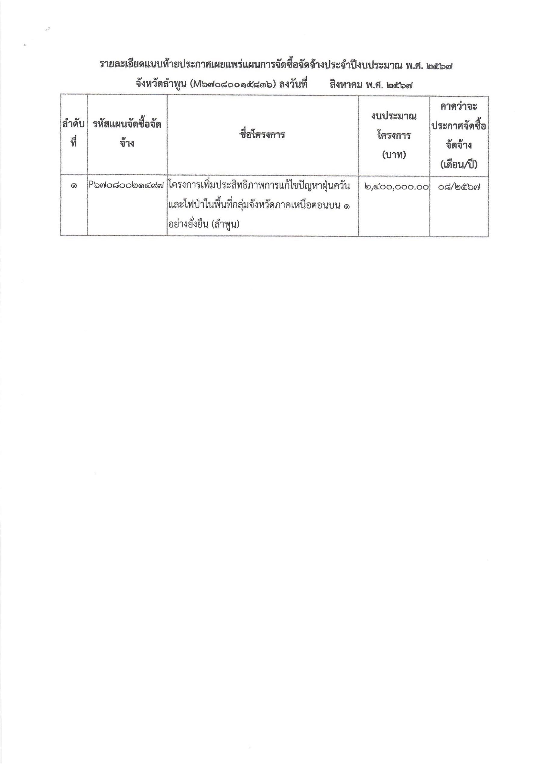 ประกาศ จังหวัดลำพูน เรื่อง เผยแพร่แผนกา รจัดซื้อจัดจ้าง ประจำปีงบประมาณ พ.ศ. ๒๕๖๗