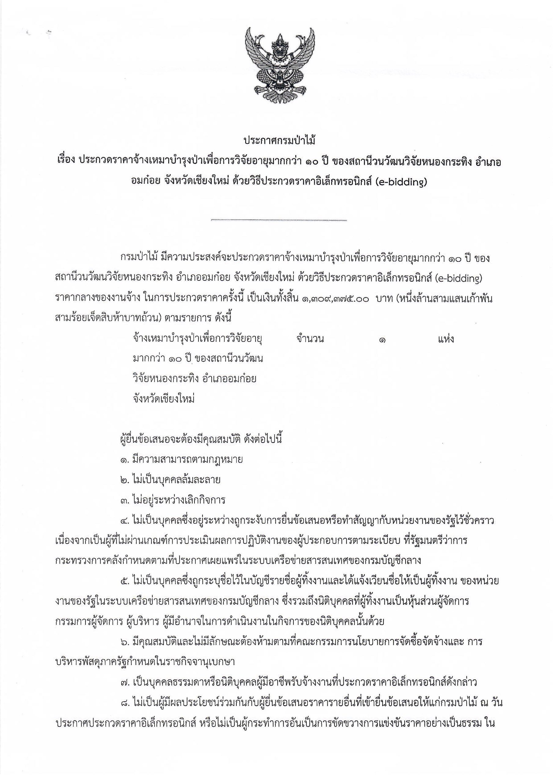 ประกาศกรมป่าไม้ เรื่อง ประกวดราคาจ้างเ หมาบำรุงป่าเพื่อการจัยอายุมากกว่า ๑๐ ปี ขอ งสถานีวนวัฒนวิจัยหนองกระทิง อำเภออมก๋อย จ ังหวัดเชียงใหม่ ด้วยวิธีประกวดราคาอิเล็ก ทรอนิกส์ (e-bidding) 24 มกราคม 2025 by mailposter แชร์สิ่งนี้:Tweet