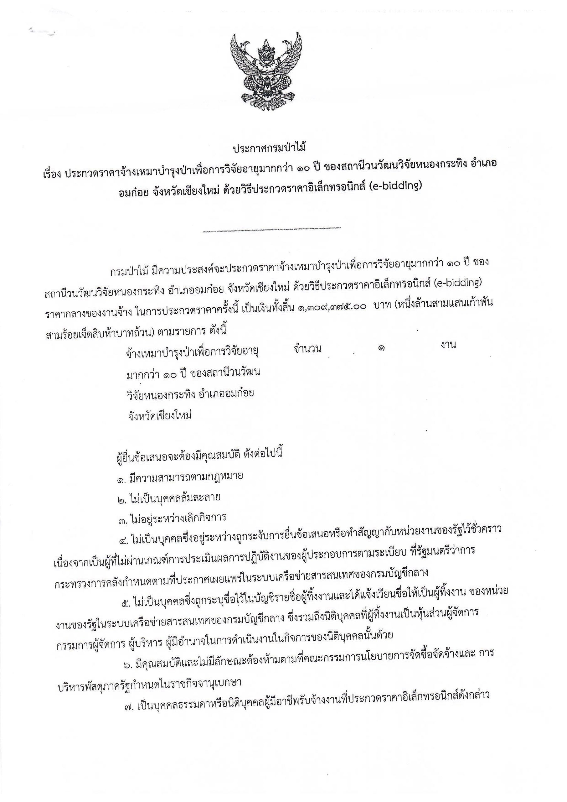 ประกาศกรมป่าไม้เรื่อง ประกวดราคาจ้างเ หมาบำรุงป่าเพื่อการวิจัยอายุมากกว่า ๑๐ ปี ของสถานีวนวัฒนวิจัยหนองกระทิง อำเภออมก๋อ ย จังหวัดเชียงใหม่ ด้วยวิธีประกวดราคาอิเล ็กทรอนิกส์ (e-bidding) 5 กุมภาพันธ์ 2025 by mailposter แชร์สิ่งนี้:Tweet