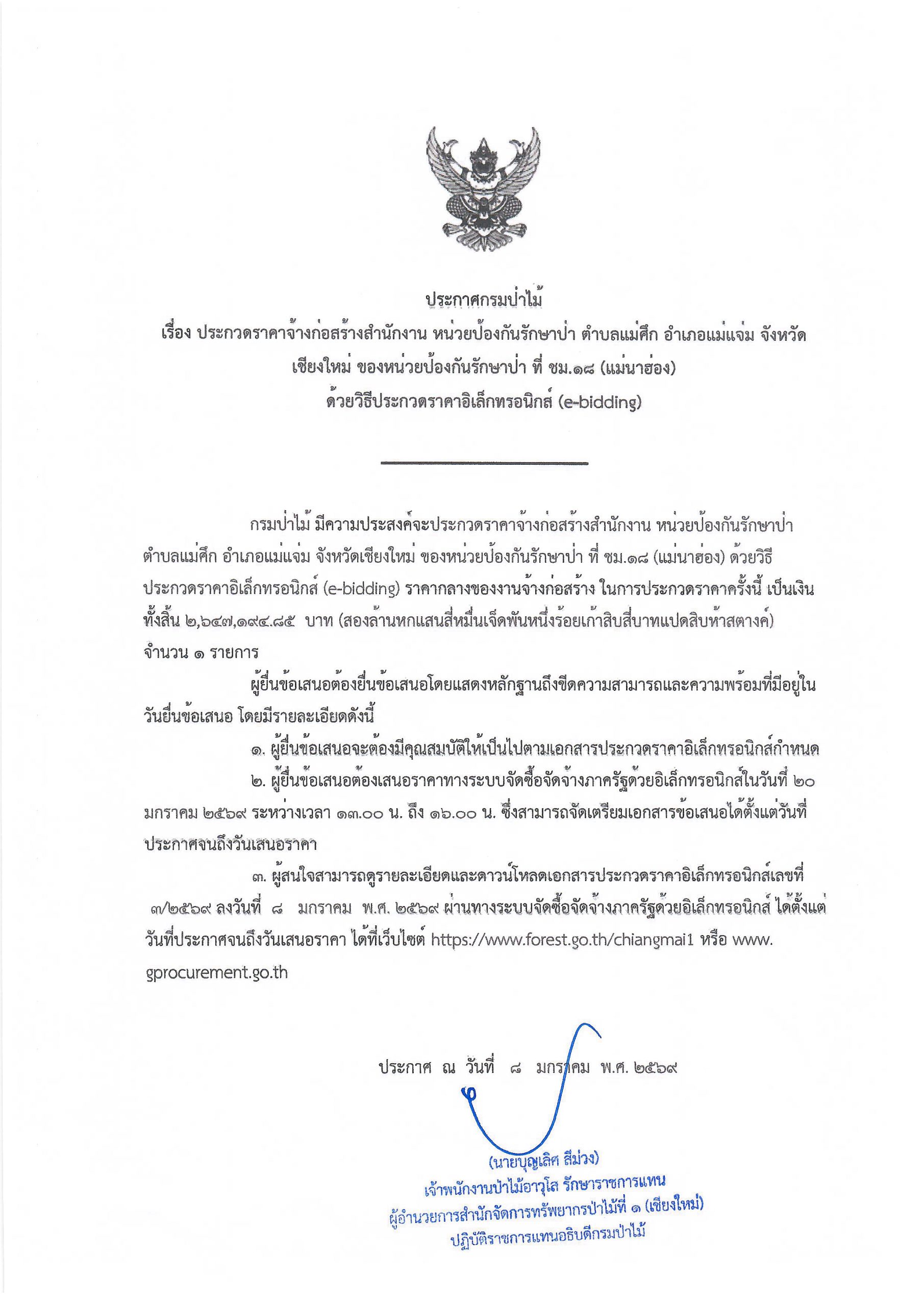 ประกาศกรมป่าไม้ เรื่อง ประกวดราคาจ้างก ่อสร้างสำนักงาน หน่วยป้องกันรักษาป่า ตำบ ลแม่ศึก อำเภอแม่แจ่ม จังหวัดเชียงใหม่ ของ หน่วยป้องกันรักษาป่า ที่่ ชม.๑๘ (แม่น่าฮ่อง) ด้วยวิธีประกวดราคาอิเล็กทรอนิกส์ (e-bidding) 9 มกราคม 2026 by mailposter แชร์สิ่งนี้:Tweet