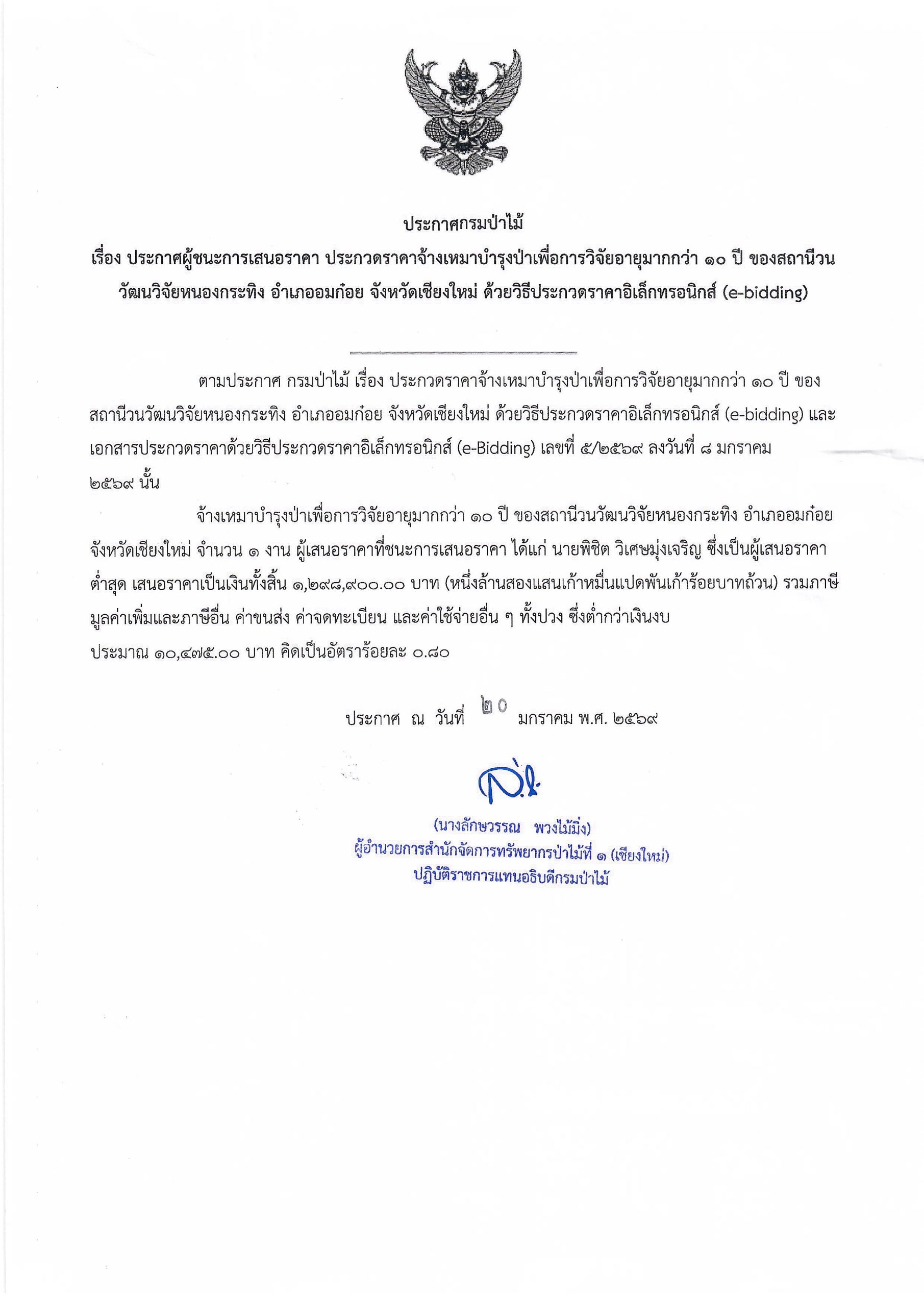 ประกาศกรมป่าไม้ เรื่อง ประกาศผู้ชนะเสน อราคา ประกวดราคาจ้างเหมาบำรุงป่าเพื่อการ วิจัยอายุมากกว่า ๑๐ ปี ของสถานีวนวัฒนวิจั ยหนองกระทิง อำเภออมก๋อย จังหวัดเชียงใหม่ ด้วยวิธีประกวดราคาอิเล็กทรอนิกส์ (e-bidding)