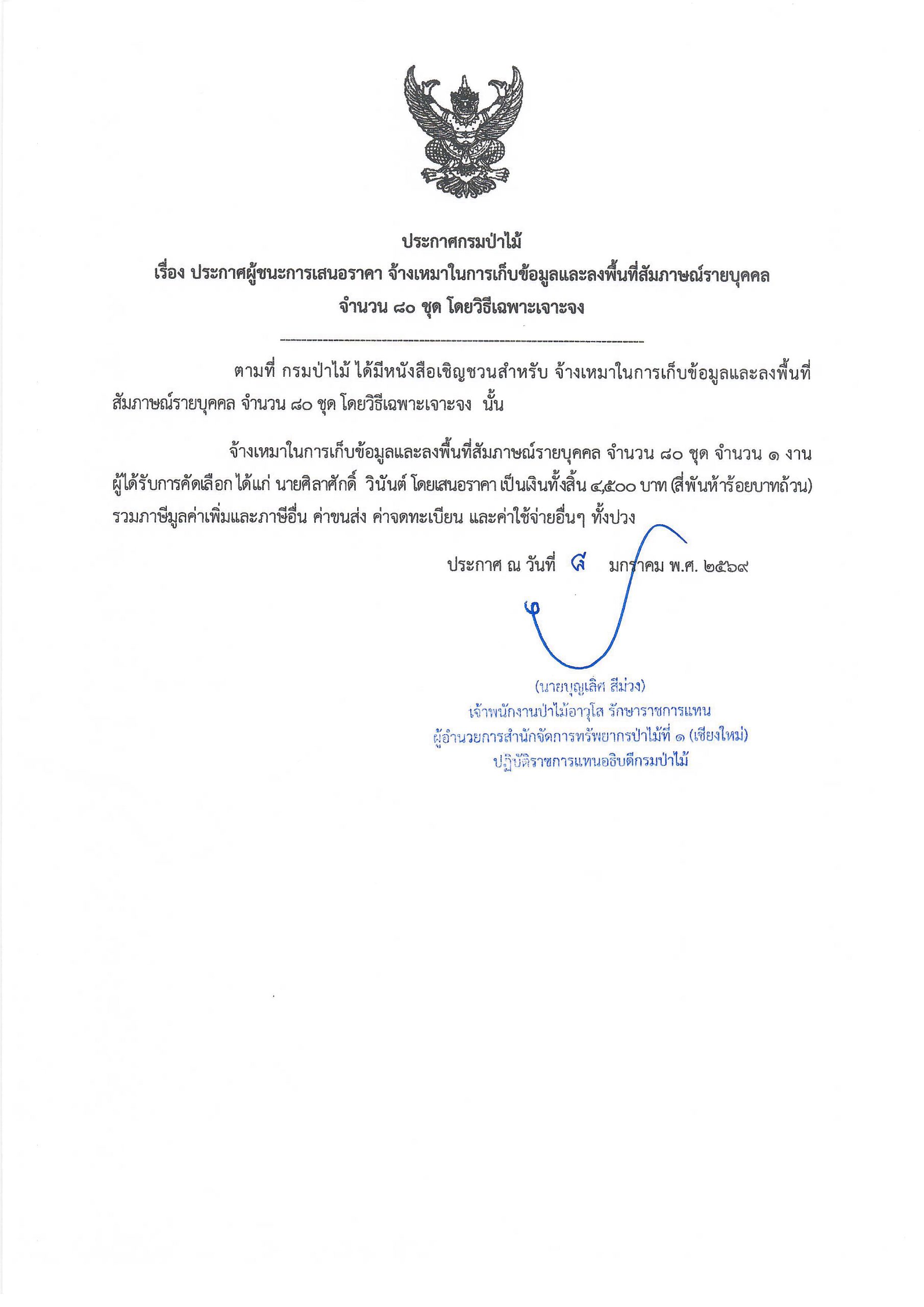 ประกาศกรมป่าไม้ เรื่อง ประกาศผู้ชนะเสน อราคา จ้างเหมาในการเก็บข้อมูลและลงพื้นที ่สัมภาษณ์รายบุคคล จำนวน ๘๐ ชุด โดยวิธีเฉพา ะเจาะจง 9 มกราคม 2026 by mailposter แชร์สิ่งนี้:Tweet