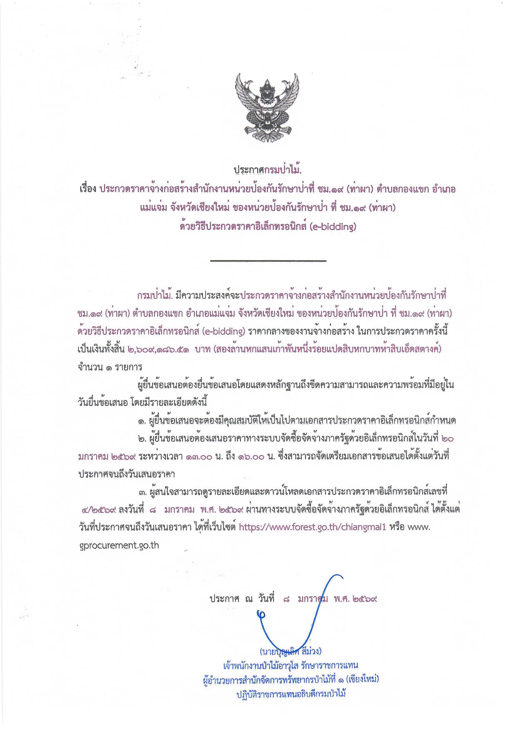 ประกาศกรมป่าไม้ เรื่อง ประกวดราคาจ้างก ่อสร้างสำนักงานหน่วยป้องกันรักษาป่าที่ ช ม.๑๙ (ท่าผา) ตำบลกองแขก อำเภอแม่แจ่ม จังหวัด เชียงใหม่ ของหน่วยป้องกันรักษาป่า ที่ ชม.๑ ๙ (ท่าผา) ด้วยวิธีประกวดราคาอิเล็กทรอนิกส์ (e-bidding) 9 มกราคม 2026 by mailposter แชร์สิ่งนี้:Tweet
