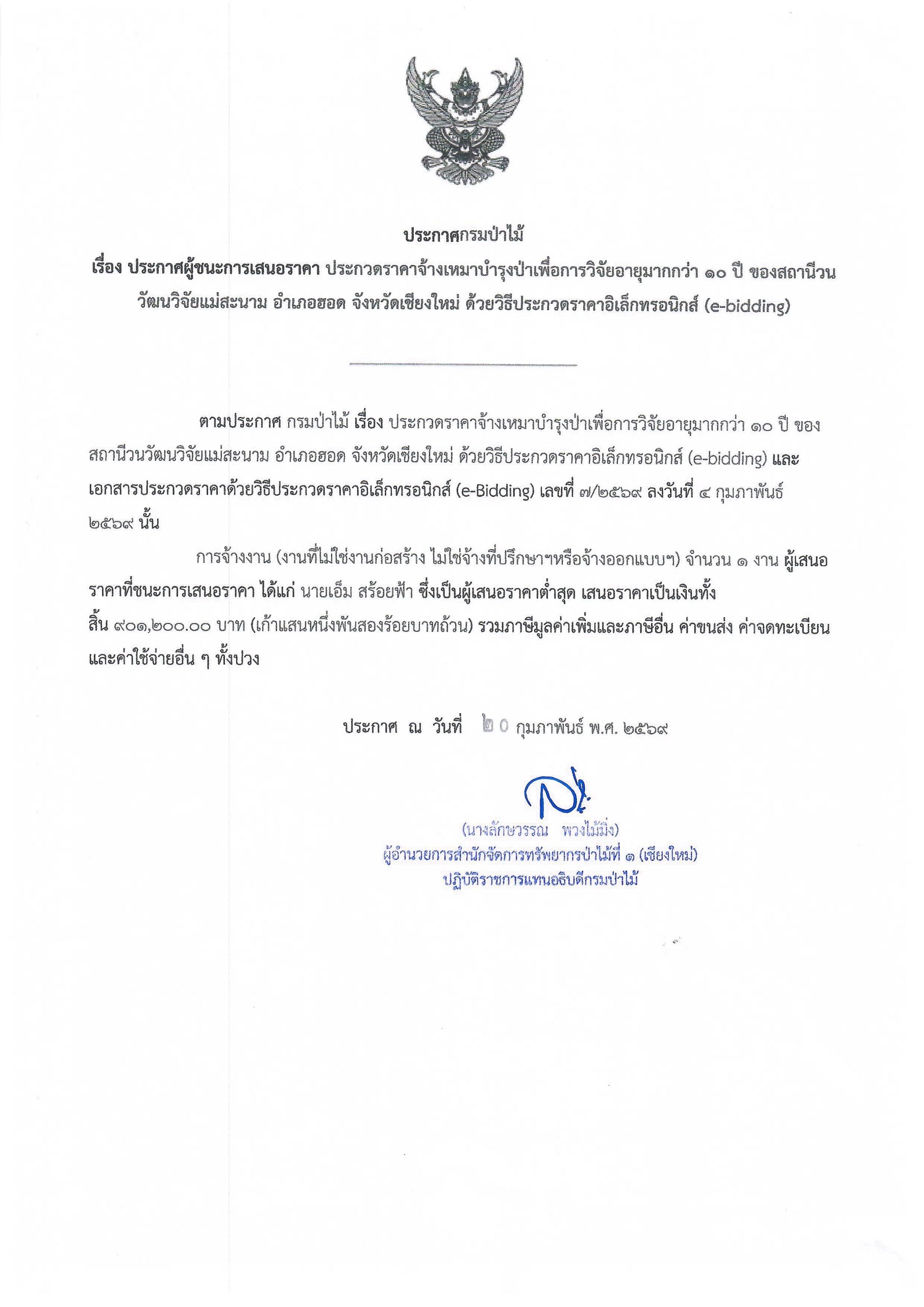 ประกาศกรมป่าไม้ เรื่อง ประกาศผู้ชนะการ เสนอราคา ประกวดราคาจ้างเหมาบำรุงป่าเพื่อ การวิจัยอายุมากกว่า ๑๐ ปี ของสถานีวนวัฒนว ิจัยแม่สะนาม อำเภอฮอด จังหวัดเชียงใหม่ ด้ วยวิธีประกวดราคาอิเล็กทรอนิกส์ (e-bidding)