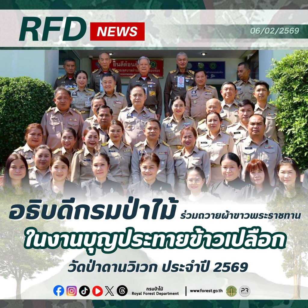 นายนิกร ศิรโรจนานนท์ อธิบดีกรมป่าไม้ ร่วมพิธีถวายผ้าขาวพระราชทาน ซึ่งพระบาทสมเด็จพระเจ้าอยู่หัว ทรงพระกรุณาโปรดเกล้าฯ ให้พลเอก สุรยุทธ์ จุลานนท์ ประธานองคมนตรี เชิญผ้าขาวพระราชทาน จำนวน 22 ม้วน ไปถวายแด่พระราชมงคลวชิรปรีดา (หลวงปู่ทุย) เจ้าอาวาสวัดป่าดานวิเวก ในงานบุญประทายข้าวเปลือก ประจำปี 2569 โดยมี นายอำพน กิตติอำพน พลเอก เฉลิมชัย สิทธิสาท พลอากาศเอก จอม รุ่งสว่าง องคมนตรี พร้อมด้วย ดร.รวีวรรณ ภูริเดช ปลัดกระทรวงทรัพยากรธรรมชาติและสิ่งแวดล้อม และคณะกรรมการโครงการพุทธสถานทรัพยากรเฉลิมพระเกียรติวัดป่าดานวิเวก ในพระบรมราชูปถัมภ์ เข้าร่วมพิธี