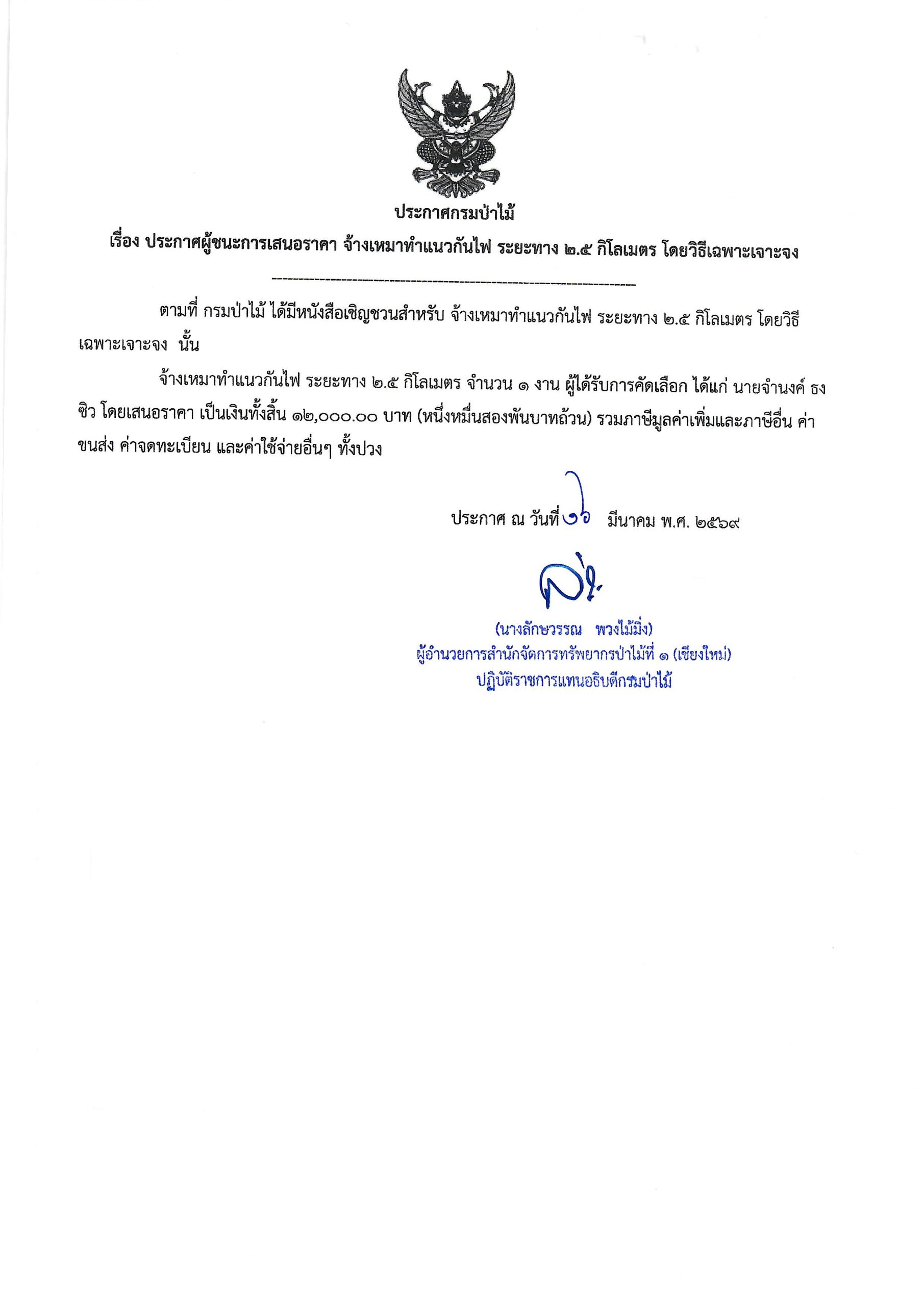 ประกาศกรมป่าไม้ เรื่อง ประกาศผู้ชนะการ เสนอราคา จ้างเหมาทำแนวกันไฟ ระยะทาง ๒.๕ กิ โลเมตร โดยวิธีเฉพาะเจาะจง
