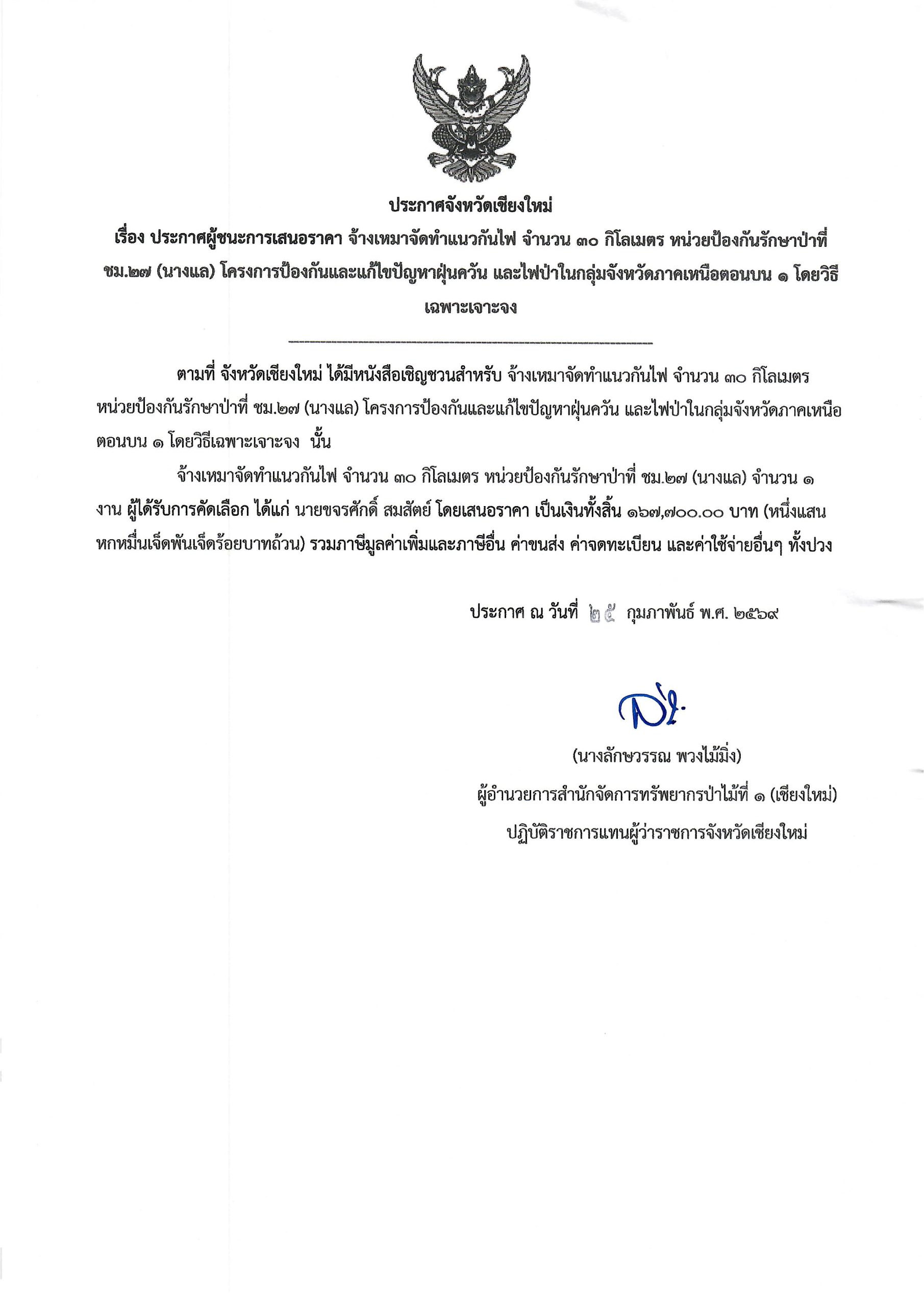 ประกาศจังหวัดเชียงใหม่ เรื่อง ประกาศผู ้ชนะการเสนอราคา จ้างเหมาจัดทำแนวกันไฟ จำ นวน ๓๐ กิโลเมตร หน่วยป้องกันรักษาป่าที่ชม. ๒๗ (นางแล) โครงการป้องกันและแก้ไขปัญหาฝุ่น ควัน และไฟป่าในกลุ่มจังหวัดภาคเหนือตอนบน ๑ โดยวิธีเฉพาะเจาะจง 6 มีนาคม 2026 by mailposter แชร์สิ่งนี้:Tweet