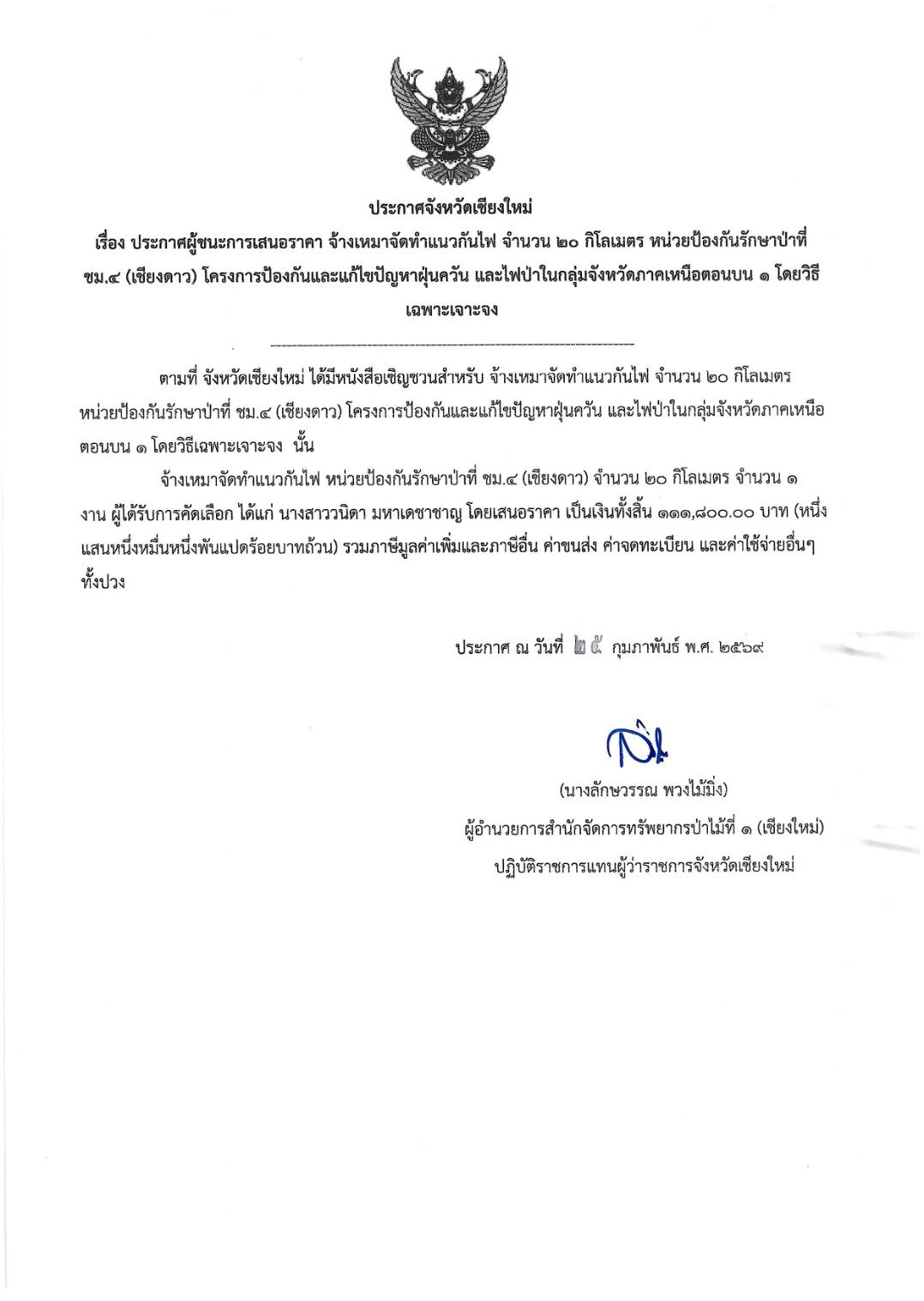 ประกาศผู้ชนะการเสนอราคา จ้างเหมาจัดทำ แนวกันไฟ จำนวน ๒๐ กิโลเมตร หน่วยป้องกันรัก ษาป่าที่ ชม.๔ (เชียงดาว) โครงการป้องกันและแ ก้ไขปัญหาฝุ่นควัน และไฟป่าในกลุ่มจังหวัด ภาคหนือตอนบน ๑ โดยวิธีเฉพาะเจาะจง 5 มีนาคม 2026 by mailposter แชร์สิ่งนี้:Tweet