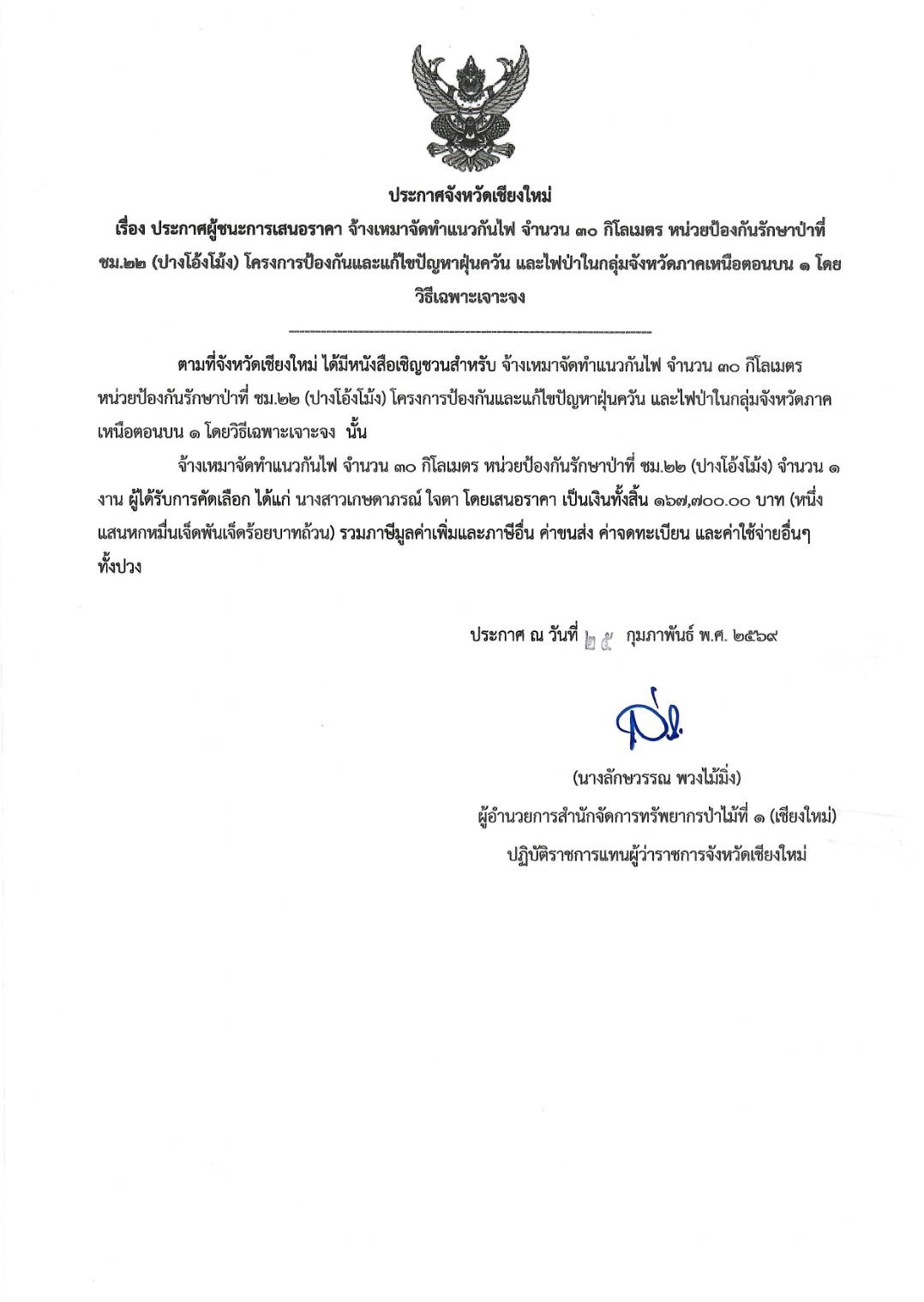 ประกาศผู้ชนะการเสนอราคา จ้างเหมาจัดทำ แนวกันไฟ จำนวน ๓๐ กิโลเมตร หน่วยป้องกันรัก ษาป่าที่ ชม.๒๒ (ปางโอ้งโม้ง) โครงการป้องกัน และแก้ไขปัญหาฝุ่นควันและไฟป่าในกลุ่มจังห วัด ภาคหนือตอนบน ๑ โดยวิธีเฉพาะเจาะจง 5 มีนาคม 2026 by mailposter แชร์สิ่งนี้:Tweet