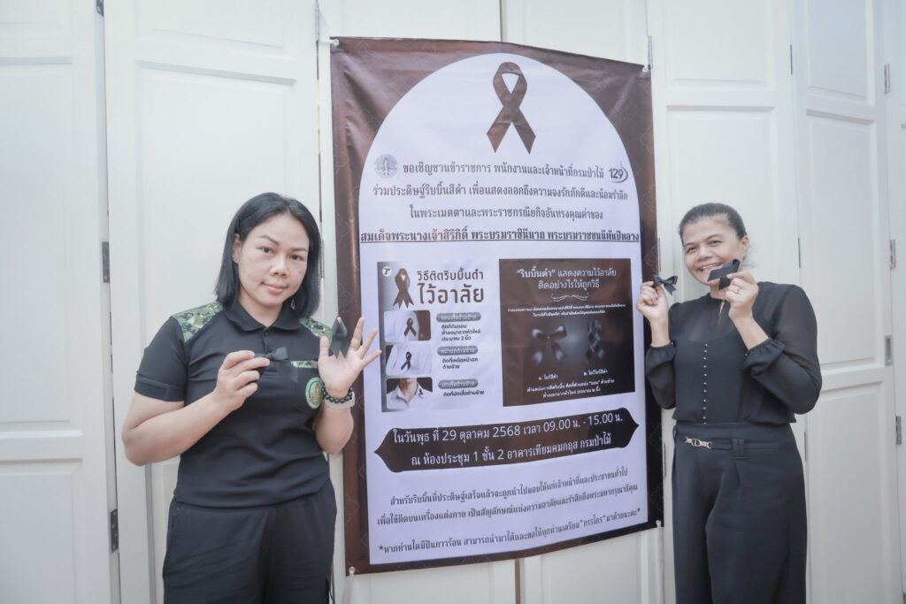 นายนิกร ศิรโรจนานนท์ อธิบดีกรมป่าไม้ และนายเผด็จ พวงจำปา ผู้อำนวยการสำนักบริหารกลาง ร่วมพร้อมด้วยผู้บริหาร ข้าราชการ และเจ้าหน้าที่กรมป่าไม้ ร่วมประดิษฐ์ “ริบบิ้นดำ” แสดงความไว้อาลัย เพื่อแสดงออกถึงความจงรักภักดีและรำลึกในพระเมตตาและพระราชกรณียกิจอันทรงคุณค่าของ สมเด็จพระนางเจ้าสิริกิติ์ พระบรมราชินีนาถ พระบรมราชชนนีพันปีหลวง ซึ่งกรมป่าไม้ได้จัดกิจกรรมดังกล่าวขึ้นเพื่อให้ข้าราชการและเจ้าหน้าที่ของกรมป่าไม้ ได้มีส่วนร่วมในกิจกรรมแสดงความจงรักภักดี สำหรับริบบิ้นที่ประดิษฐ์ขึ้นแล้วเสร็จ จะถูกนำไปมอบให้แก่เจ้าหน้าที่และประชาชนทั่วไปเพื่อใช้ติดเครื่องแต่งกาย เป็นสัญลักษณ์แห่งความอาลัยและร่วมรำลึกในพระมหากรุณาธิคุณ
