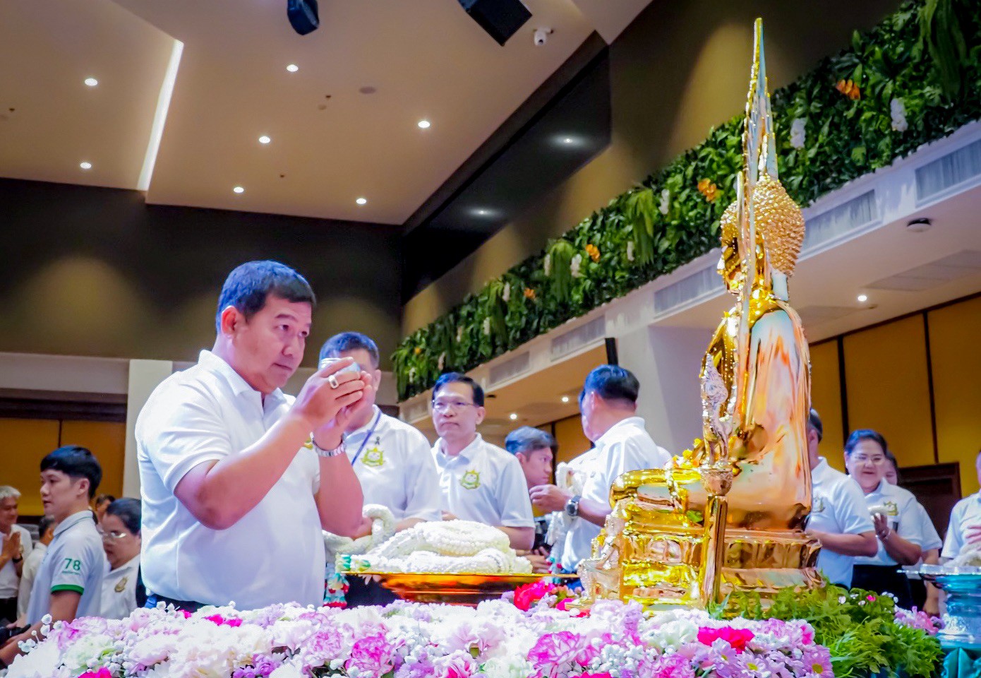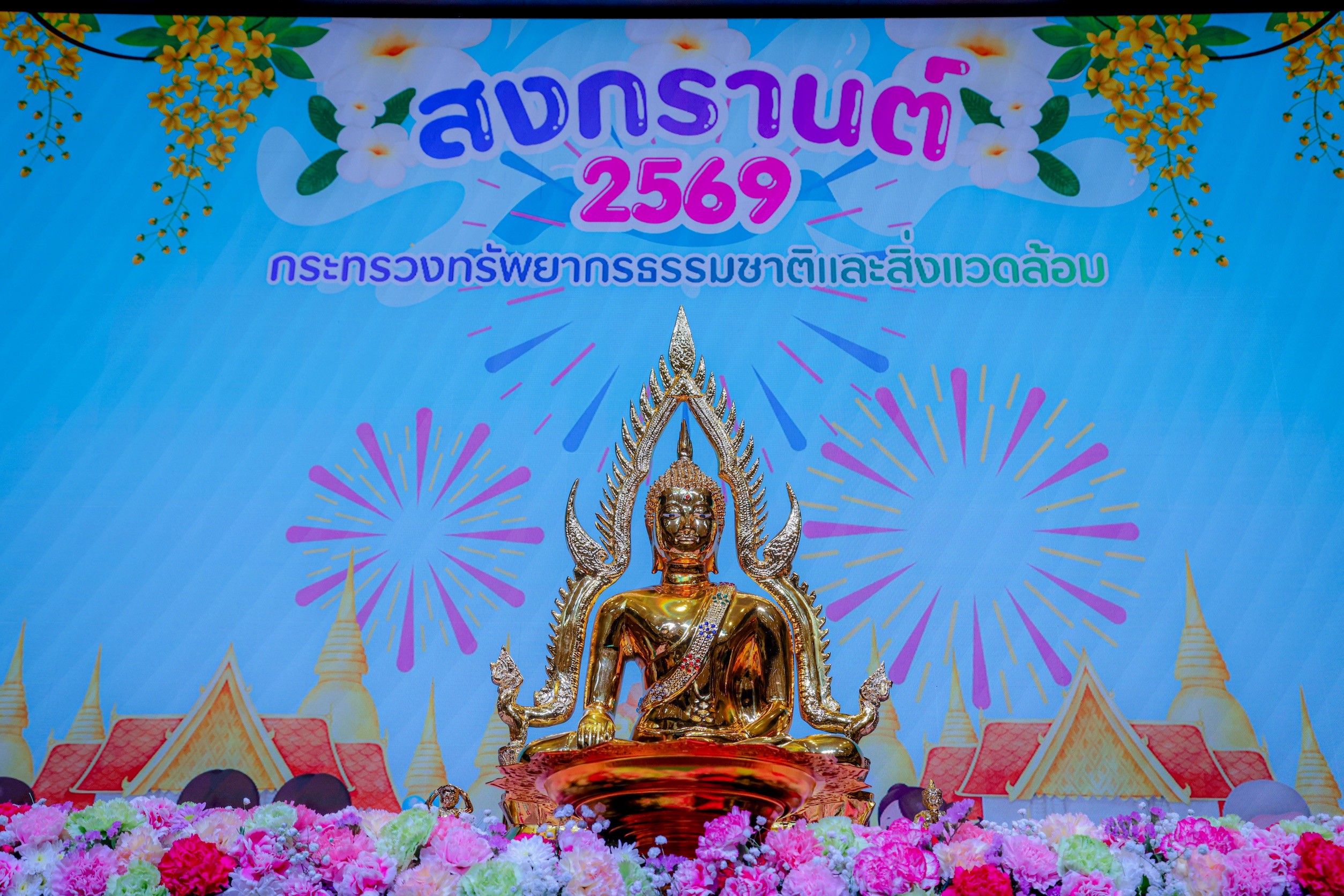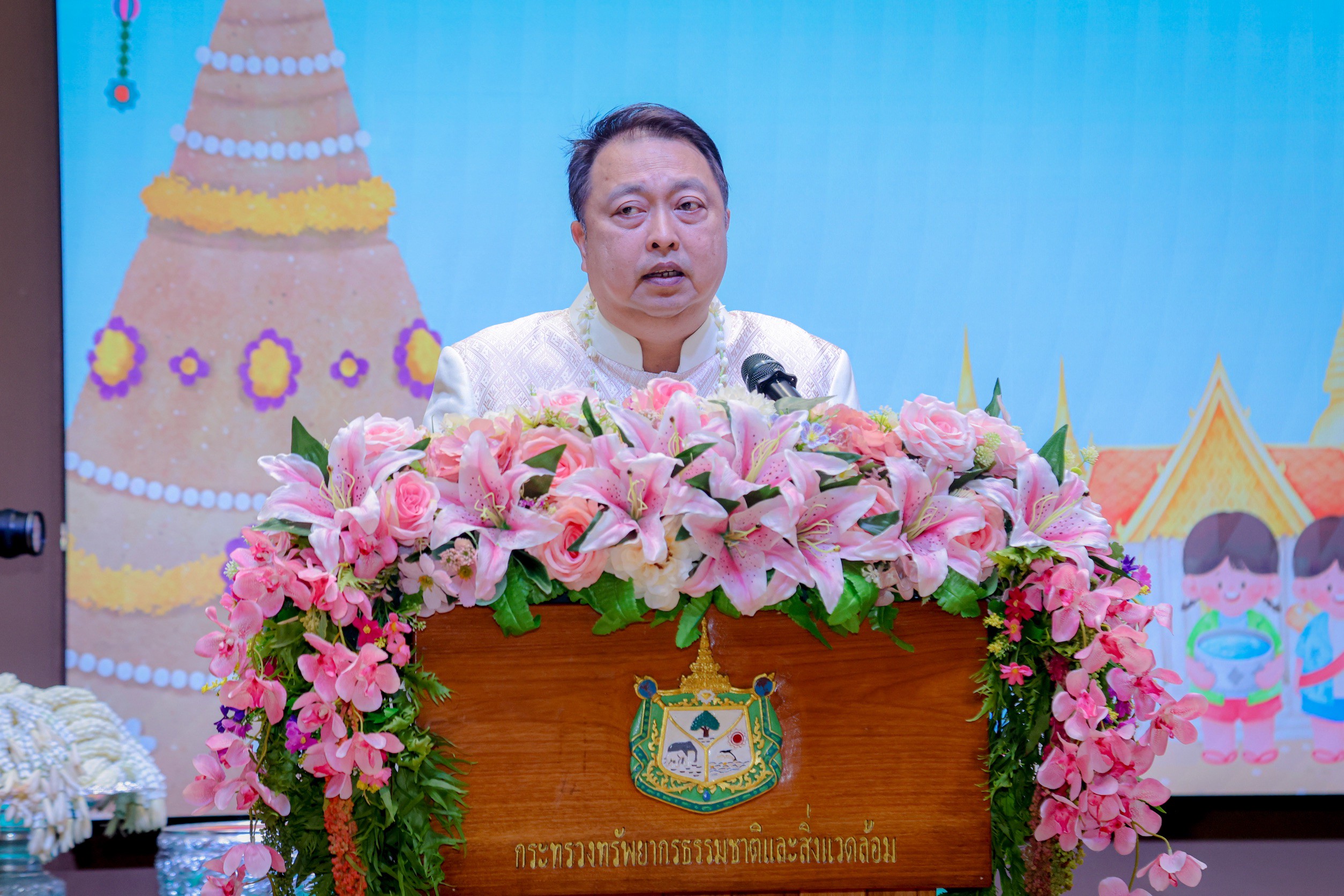 นายสุชาติ ชมกลิ่น รมว.ทส. กล่าวว่า รู้สึกยินดีเป็นอย่างยิ่งที่ได้ร่วมกิจกรรมสรงน้ำพระ ซึ่งเป็นประเพณีสำคัญที่สะท้อนถึงความเคารพศรัทธาในพระพุทธศาสนา และเป็นการเริ่มต้นปีใหม่ไทยอย่างเป็นสิริมงคล พร้อมกันนี้ยังได้กล่าวให้กำลังใจบุคลากรทุกคน ขอให้มีความเข้มแข็งทั้งกายและใจ ให้ความสำคัญและให้กำลังใจกับครอบครัว และร่วมเป็นส่วนหนึ่งในการขับเคลื่อนการแก้ไขปัญหาของประเทศและในโอกาสนี้ ได้อาราธนาคุณพระศรีรัตนตรัยและสิ่งศักดิ์สิทธิ์ทั้งหลาย ดลบันดาลพรให้ผู้บริหาร ข้าราชการ เจ้าหน้าที่ และครอบครัวของกระทรวงทรัพยากรธรรมชาติและสิ่งแวดล้อม ประสบแต่ความสุข ความเจริญ มีสุขภาพแข็งแรง ปราศจากโรคภัย และมีกำลังกายกำลังใจในการปฏิบัติหน้าที่เพื่อประเทศชาติต่อไป