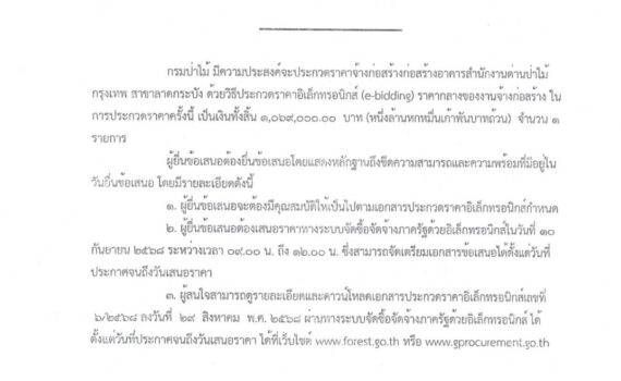 ประกาศกรมป่าไม้ เรื่อง ประกวดราคาจ้างก่อสร้างก่อสร้างอาคารสำนักงานด่านป่าไม้กรุงเทพ สาขาลาดกระบัง ด้วยวิธีประกวดราคาอิเล็กทรอนิกส์ …