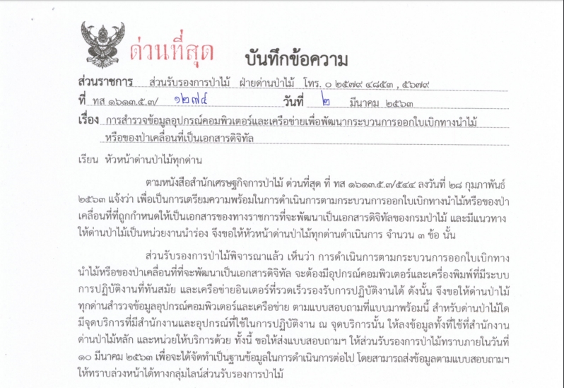 การสำรวจข้อมูลอุปกรณ์คอมพิวเตอร์และเครือข่ายเพื่อพัฒนากระบวนการออกใบเบิกทางนำไม้หรือของป่าเคลื่อนที่เป็นเอกสารดิจิทัล เผยแพร่แล้ว 2 มีนาคม 2020 การสำรวจข้อมูลอุปกรณ์คอมพิวเตอร์และเครือข่ายเพื่อพัฒนากระบวนการออกใบเบิกทางนำไม้หรือของป่าเคลื่อนที่เป็นเอกสารดิจิทัล ดาวน์โหลด