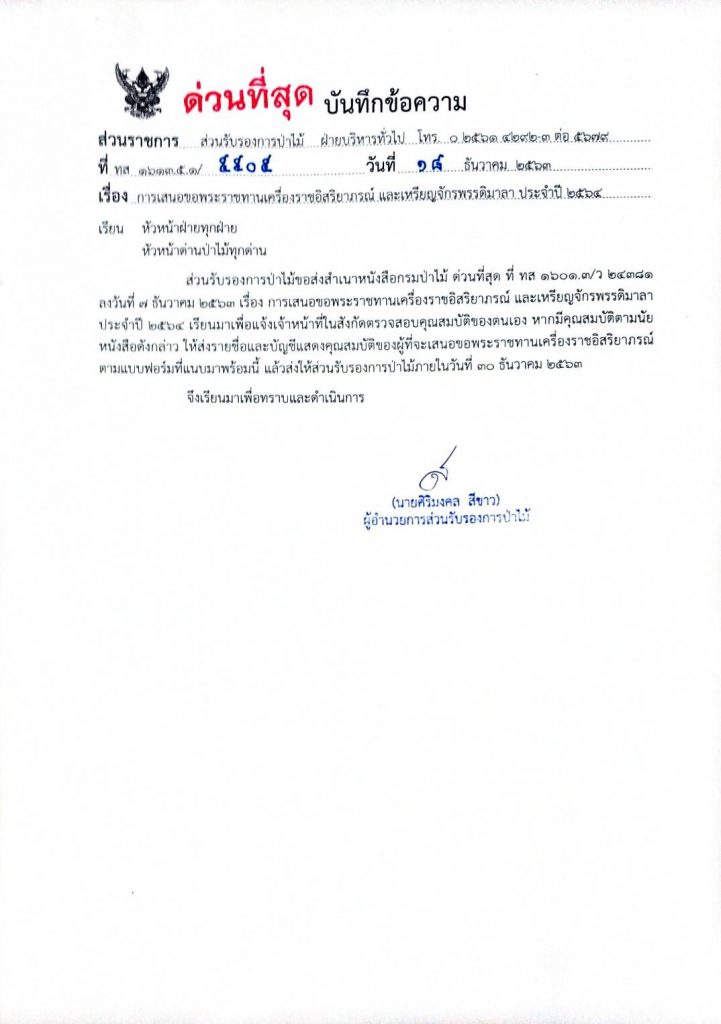 การเสนอขอพระราชทานเครื่องราชอิสริยาภรณ์ และเหรียญจักรพรรดิมาลา ประจำปี ๒๕๖๔ (หัวหน้าฝ่ายทุกฝ่าย หัวหน้าด่านป่าไม้ทุกด่าน) เผยแพร่แล้ว 18 ธันวาคม 2020 การเสนอขอพระราชทานเครื่องราชอิสริยาภรณ์ และเหรียญจักรพรรดิมาลา ประจำปี ๒๕๖๔ (หัวหน้าฝ่ายทุกฝ่าย หัวหน้าด่านป่าไม้ทุกด่าน)ดาวน์โหลดแบบฟอร์ม-ขร.4ดาวน์โหลดแบบฟอร์ม-ลจ.3ดาวน์โหลดแบบฟอร์ม-พร.4ดาวน์โหลด