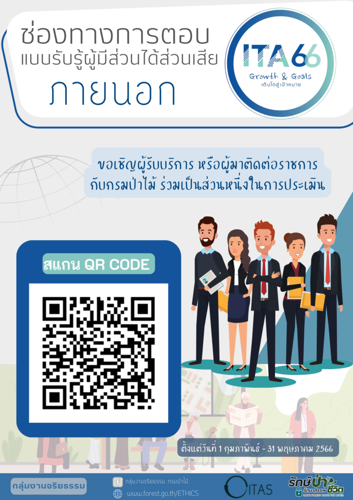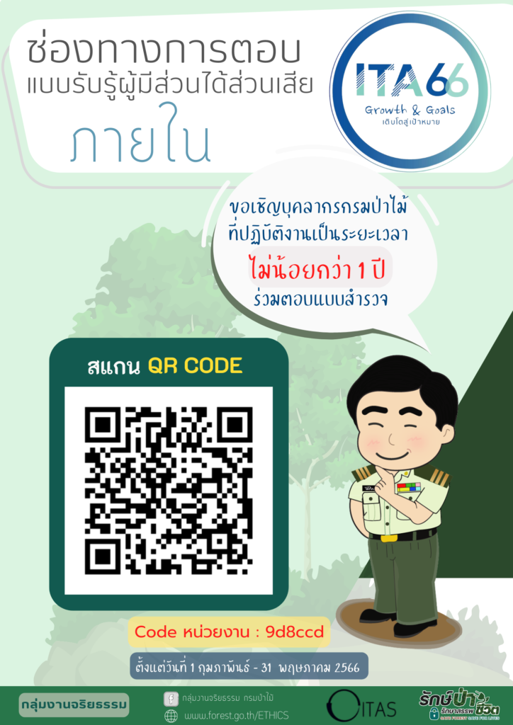 ขอให้เร่งรัดบุคลากรเข้าตอบแบบประเมินผู้มีส่วนได้ส่วนเสียภายใน (IIT) และประชาสัมพันธ์ให้ผู้มีส่วนได้ ส่วนเสียภายนอก (EIT) เข้าตอบแบบประเมินคุณธรรมและโปร่งใส่ฯ (ITA) ของกรมป่าไม้ เผยแพร่แล้ว 3 พฤษภาคม 2023 เเจ้งเวียนฝ่ายทุกฝ่ายเเละด่านป่าไม้ทุดาวน์โหลด