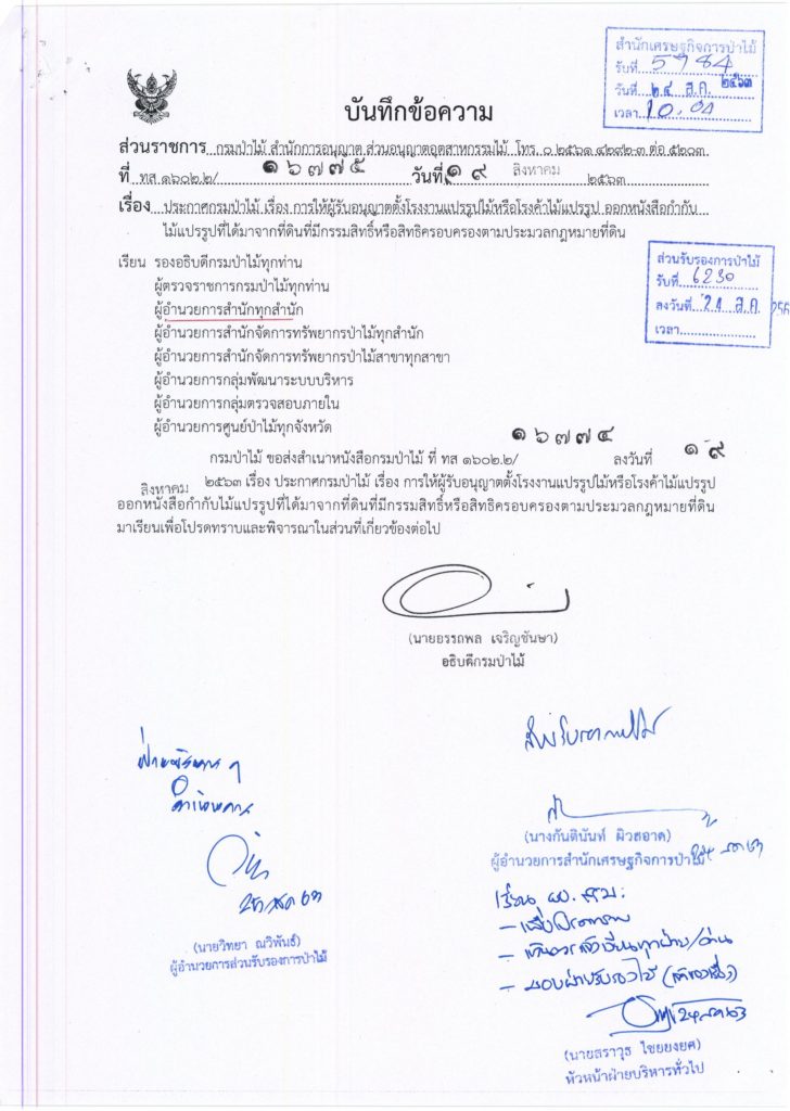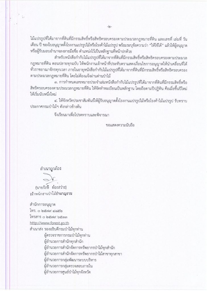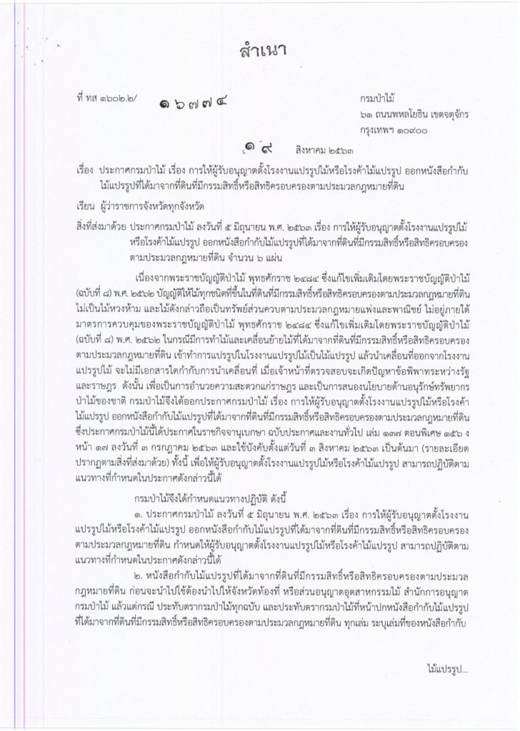 ประกาศกรมป่าไม้ เรื่องการให้ผู้รับอนุญาตตั้งโรงงานแปรรูปไม้หรือโรงค้าไม้แปรรูป ออกหนังสือกำกับไม้แปรรูปที่ได้มาจากที่ดินที่มีกรรมสิทธิ์หรือสิทธิครอบครองตามประมวลกฎหมายที่ดิน เผยแพร่แล้ว 25 สิงหาคม 2020 ประกาศกรมป่าไม้ เรื่องการให้ผู้รับอนุญาตตั้งโรงงานแปรรูปไม้…..ดาวน์โหลดประกาศกรมป่าไม้ เรื่องการให้ผู้รับอนุญาตตั้งโรงงานแปรรูปไม้..(เพิ่มดาวน์โหลด
