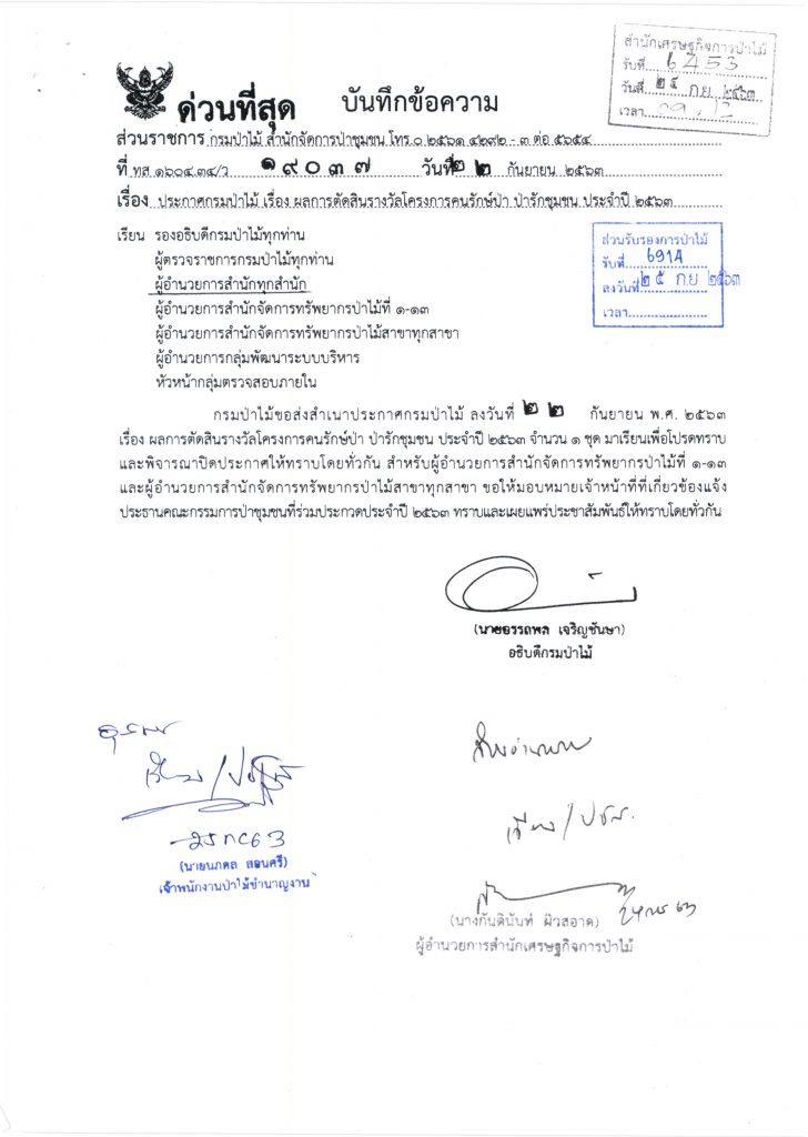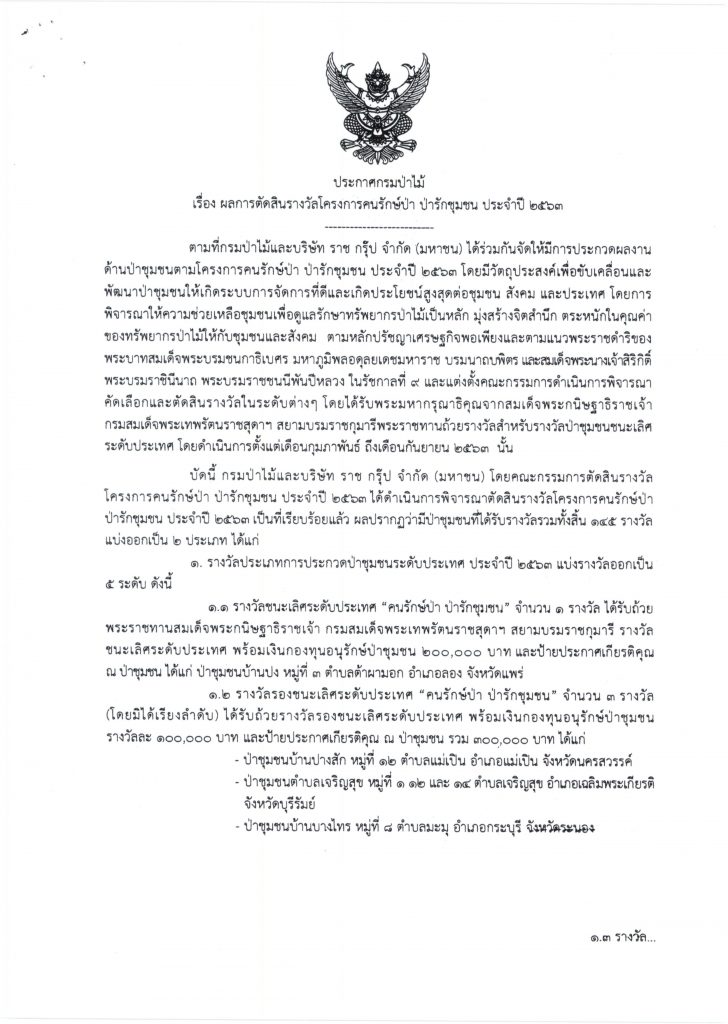 ประกาศกรมป่าไม้ เรื่อง ผลการตัดสินรางวัลโครงการคนรักษ์ป่า ป่ารักชุมชน ประจำปี 2563 เผยแพร่แล้ว 30 กันยายน 2020 ประกาศกรมป่าไม้ เรื่อง ผลการตัดสินรางวัลโครงการคนรักษ์ป่า ป่ารักชุมชน ประจำปี 2563ดาวน์โหลด