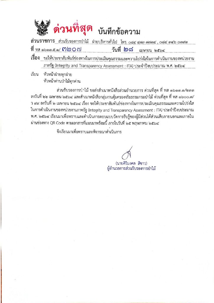 เรื่อง ขอให้ประชาสัมพันธ์ช่องทางในการประเมินคุณธรรมและความโปร่งใสในการดำเนินงานของหน่วยงานภาครัฐ (Integrity and Transparency Assessment : ITA) ประจำปีงบประมาณ พ.ศ. 2564 เผยแพร่แล้ว 28 เมษายน 2021 เรื่อง ขอให้ประชาสัมพันธ์ช่องทางในการประเมินคุณธรรมและความโปร่งใสในการดำเนินงานของหน่วยงานภาครัฐ (Integrity and Transparency Assessment : ITA) ประจำปีงบประมาณ พ.ศ. 2564ดาวน์โหลด