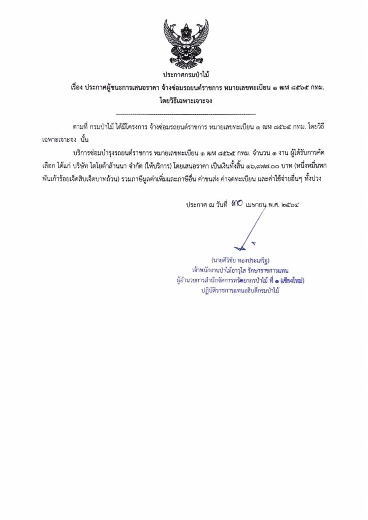 ประกาศกรมป่าไม้ เรื่อง ประกาศผู้ชนะการเสนอราคา จ้างช่อมรถยนต์ราชการ หมายเลขทะเบียน 1 ฒฬ 8565 กทม. โดยวิธีเฉพาะเจาะจง30 เมษายน 2021 ใน ประกาศจัดซื้อจัดจ้าง by adminir