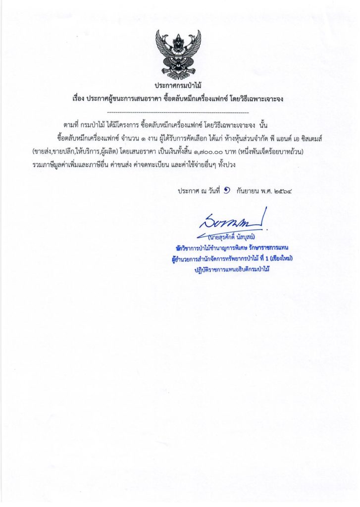 ประกาศกรมป่าไม้ เรื่อง ประกาศผู้ชนะการเสนอราคา ซื้อตลับหมึกเครื่องแฟกซ์ โดยวิธีเฉพาะเจาะจง1 กันยายน 2021 ใน ประกาศ by adminir