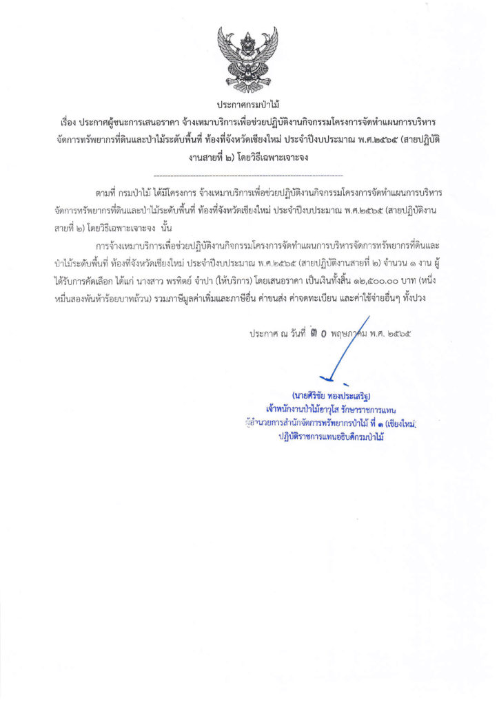 ประกาศกรมป่าไม้ เรื่อง ประกาศผู้ชนะการเสนอราคา จ้างเหมาบริการเพื่อช่วยปฏิบัติงานกิจกรรมโครงการจัดทำแผนการบริหาร จัดการทรัพยากรที่ดินและป่าไม้ระดับพื้นที่ ท้องที่จังหวัดเชียงใหม่ ประจำปีงบประมาณ พ.ศ.๒๕๖๕ (สายปฏิบัติงานสายที่ ๒) โดยวิธีเฉพาะเจาะจง30 พฤษภาคม 2022 ใน ประกาศ by adminir
