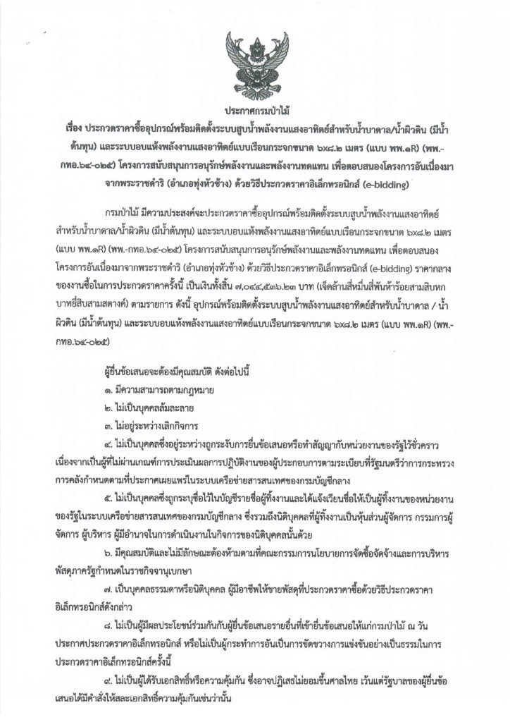 หน้าแรก » ประกาศ » ประกาศกรมป่าไม้ เรื่อง ประกวดราคาซื้ออุปกรณ์พร้อมติดตั้งระบบสูบน้ำพลังงานแสงอาทิตย์สำหรับน้ำบาดาล/น้ำผิวดิน (มีน้ำต้นทุน) และระบบอบแห้งพลังงานแสงอาทิตย์แบบเรือนกระจกขนาด ๖x๘.๒ เมตร (แบบ พพ.๑R) (พพ.-กทอ.๖๔-๐๒๕) โครงการสนับสนุนการอนุรักษ์พลังงานและพลังงานทดแทน เพื่อตอบสนองโครงการอันเนื่องมาจากพระราชดำริ (อำเภอทุ่งหัวช้าง ด้วยวิธีประกวดราคาอิเล็กทรอนิกส์ (e-bidding)