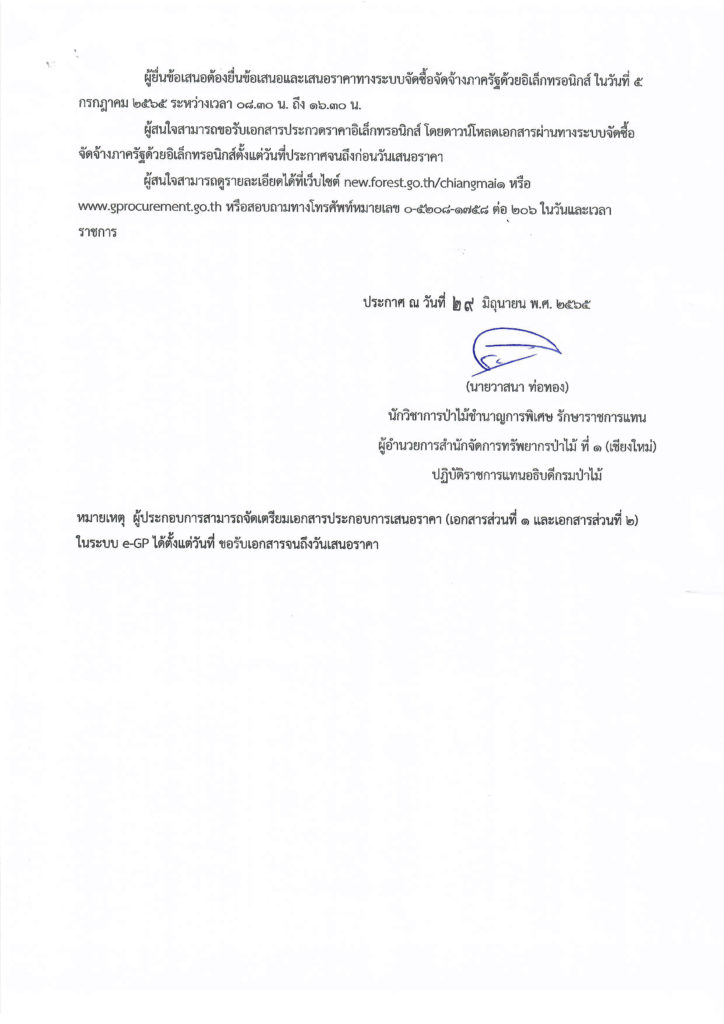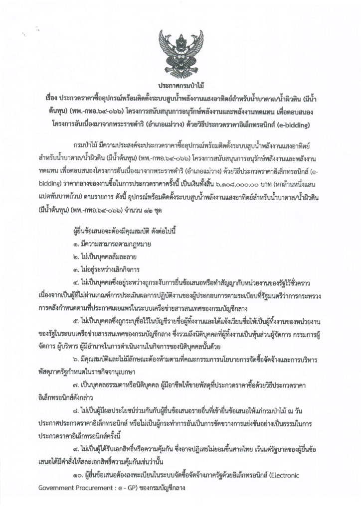หน้าแรก » ประกาศ » ประกาศกรมป่าไม้ เรื่อง ประกวดราคาซื้ออุปกรณ์พร้อมติดตั้งระบบสูบน้ำพลังงานแสงอาทิตย์สำหรับน้ำบาดาล/น้ำผิวดิน (มีน้ำต้นทุน) (พพ.-กทอ.๖๔-๐๖๖) โครงการสนับสนุนการอนุรักษ์พลังงานและพลังงานทดแทน เพื่อตอบสนองโครงการอันเนื่องมาจากพระราชดำริ (อำเภอแม่วาง) ด้วยวิธีประกวดราคาอิเล็กทรอนิกส์ (e-bidding)