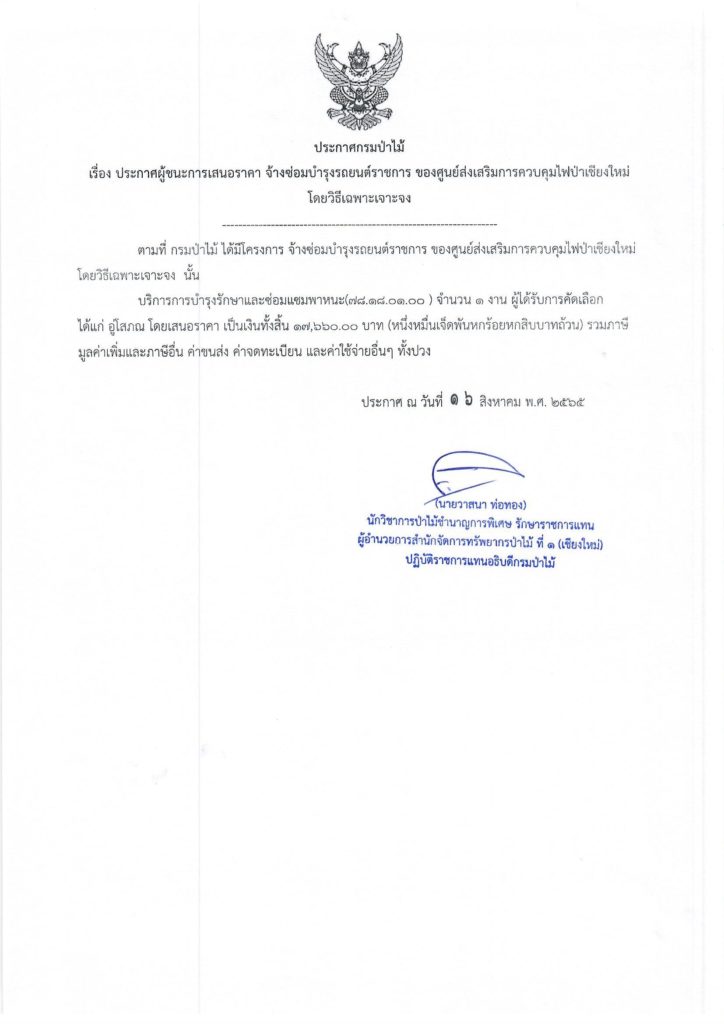 ประกาศกรมป่าไม้16 สิงหาคม 2022 ใน ไม่มีหมวดหมู่ by adminir ประกาศกรมป่าไม้ เรื่อง ประกาศผู้ชนะการเสนอราคา จ้างซ่อมบำรุงรถยนต์ราชการ ของศูนย์ส่งเสริมการควบคุมไฟป่าเชียงใหม่โดยวิธีเฉพาะเจาะจง