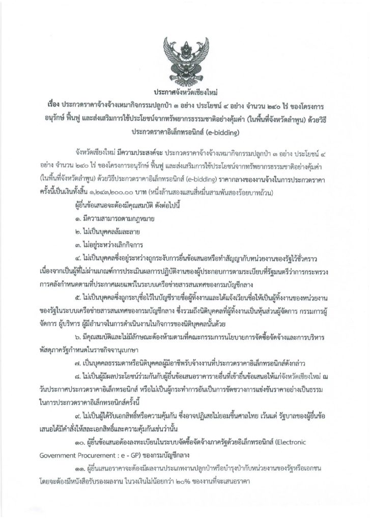 หน้าแรก » ประกาศ » ประกาศจังหวัดเชียงใหม่ เรื่อง ประกวดราคาจ้างจ้างเหมากิจกรรมปลูกป่า 3 อย่าง ประโยชน์ 4 อย่าง จำนวน 240 ไร่ ของโครงการอนุรักษ์ พื้นฟู และส่งเสริมการใช้ประโยชน์จากทรัพยากรธรรมชาติอย่างคุ้มค่า (ในพื้นที่จังหวัดลำพูน) ด้วยวิธีประกวดราคาอิเล็กทรอนิกส์ (e-bidding)