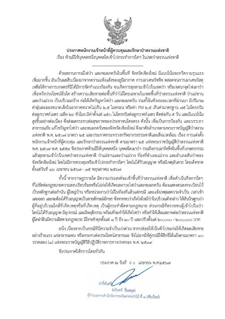 ประกาศพนักงานเจ้าหน้าที่ผู้ควบคุมและรักษาป่าสงวนแห่งชาติ11 เมษายน 2024 ใน ประกาศ by adminir เรื่่อง ห้ามมิให้บุคคลหนึ่งบุคคลใดเข้าไปกระทำการใดๆ ในเขตป่าสงวนแห่งชาติ