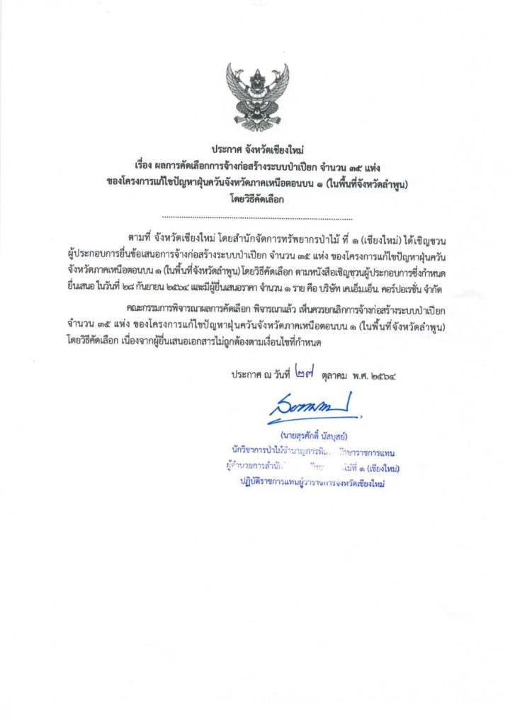 ประกาศ จังหวัดเชียงใหม่ เรื่อง ผลการคัดเลือกการจ้างก่อสร้างระบบป่าเปียก จำนวน ๓๕ แห่งของโครงการแก้ไขปัญหาฝุ่นควันจังหวัดภาคเหนือตอนบน (ในพื้นที่จังหวัดลำพูน) โดยวิธีคัดเลือก2 พฤศจิกายน 2021 ใน ประกาศ by adminir