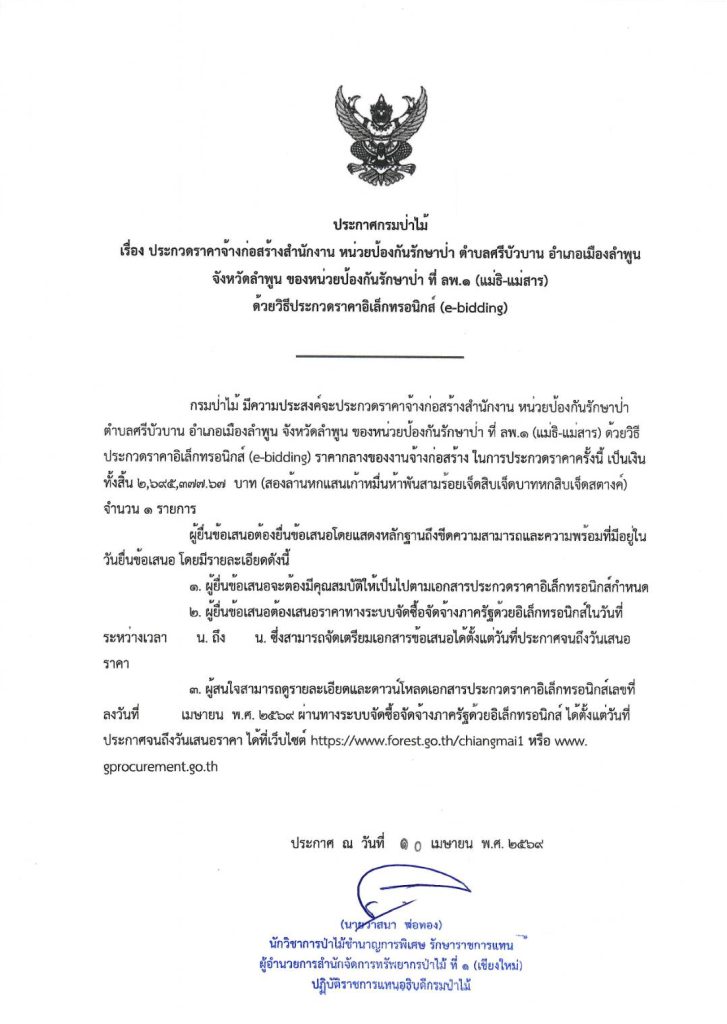 ประกวดราคาจ้างก่อสร้างสำนักงาน หน่วยป้องกันรักษาป่า ตำบลศรีบัวบาน อำเภอเมืองลำพูน จังหวัดลำพูน ของหน่วยป้องกันรักษาป่า ที่ ลพ.๑ (แม่ธิ-แม่สาร) ด้วยวิธีประกวดราคาอิเล็กทรอนิกส์ (e-bidding)16 เมษายน 2026 ใน ประกวดราคาจ้าง / ประกาศจัดซื้อจัดจ้าง by adminir