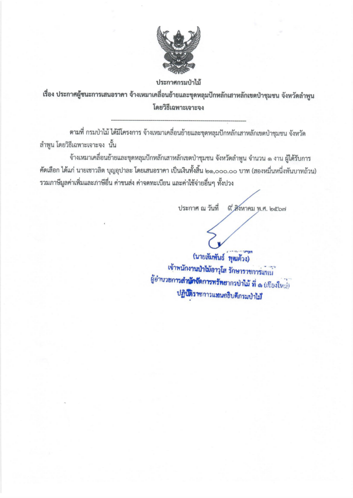 ประกาศกรมป่าไม้เรื่อง ประกาศผู้ชนะการเสนอราคา จ้างเหมาเคลื่อนย้ายและขุดหลุมปักหลักเสาหลักเขตป่าชุมชน จังหวัดลำพูนโดยวิธีเฉพาะเจาะจง