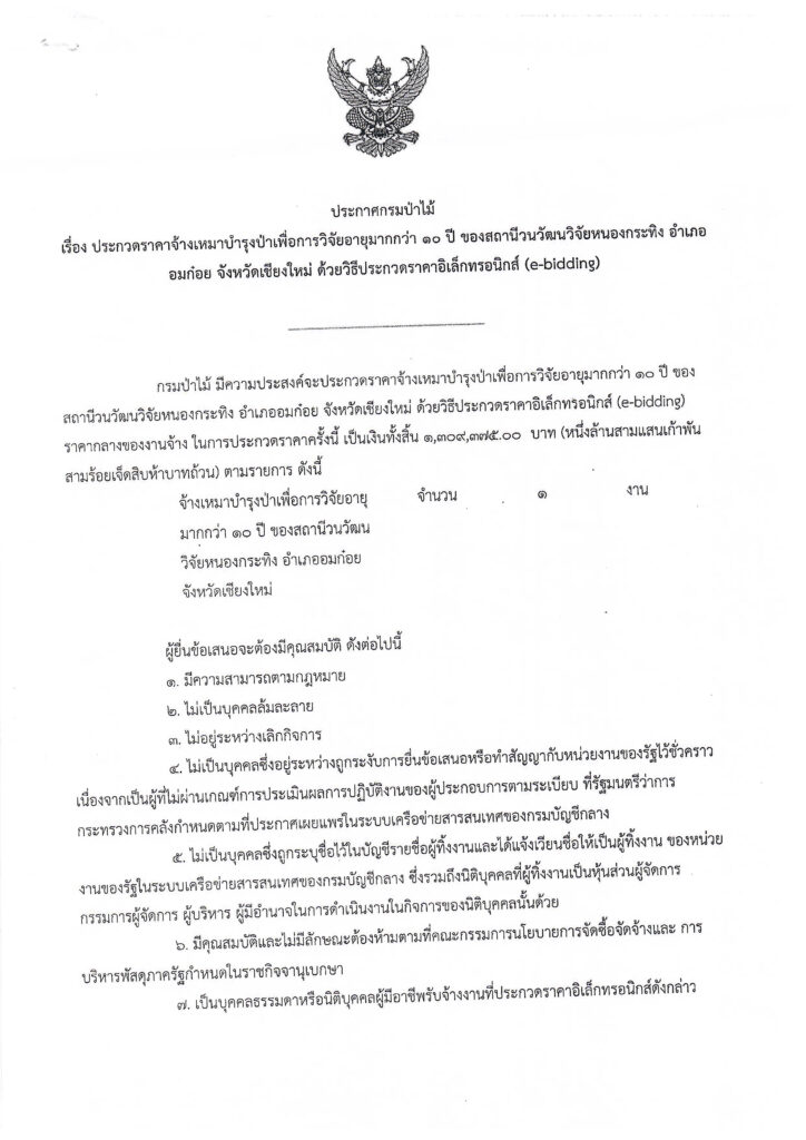 ประกาศกรมป่าไม้เรื่อง ประกวดราคาจ้างเหมาบำรุงป่าเพื่อการวิจัยอายุมากกว่า ๑๐ ปี ของสถานีวนวัฒนวิจัยหนองกระทิง อำเภออมก๋อย จังหวัดเชียงใหม่ ด้วยวิธีประกวดราคาอิเล็กทรอนิกส์ (e-bidding)5 กุมภาพันธ์ 2025 ใน ประกวดราคาจ้าง / ประกาศจัดซื้อจัดจ้าง by adminir