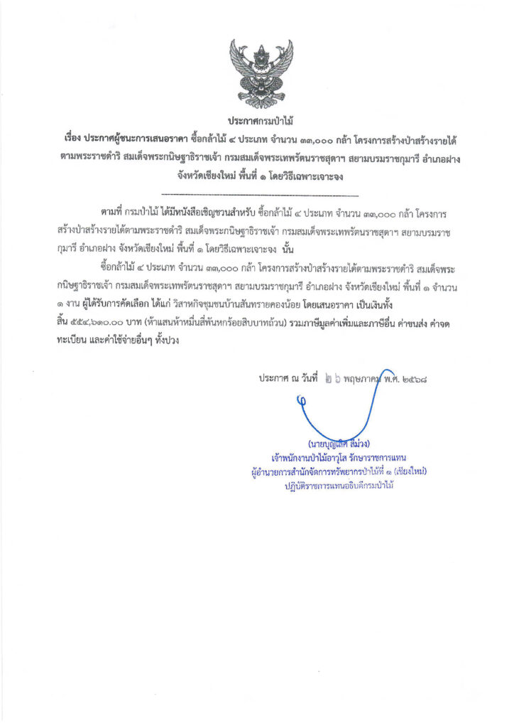ประกาศกรมป่าไม้เรื่อง ประกาศผู้ชนะการเสนอราคา ซื้อกล้าไม้ ๔ ประเภท จำนวน ๓๓,๐๐๐ กล้า โครงการสร้างป่าสร้างรายได้พระราชดำริ สมเด็จพระกนิษฐาธิราชเจ้า กรมสมเด็จพระเทพรัตนราชสุดาฯ สยามบรมราชกุมารี อำเภอฝาง จังหวัดเชียงใหม่ พื้นที่ ๑ โดยวิธีเฉพาะเจาะจง26 พฤษภาคม 2025 ใน ประกาศจัดซื้อจัดจ้าง / ประกาศผู้ชนะการเสนอราคา by adminir