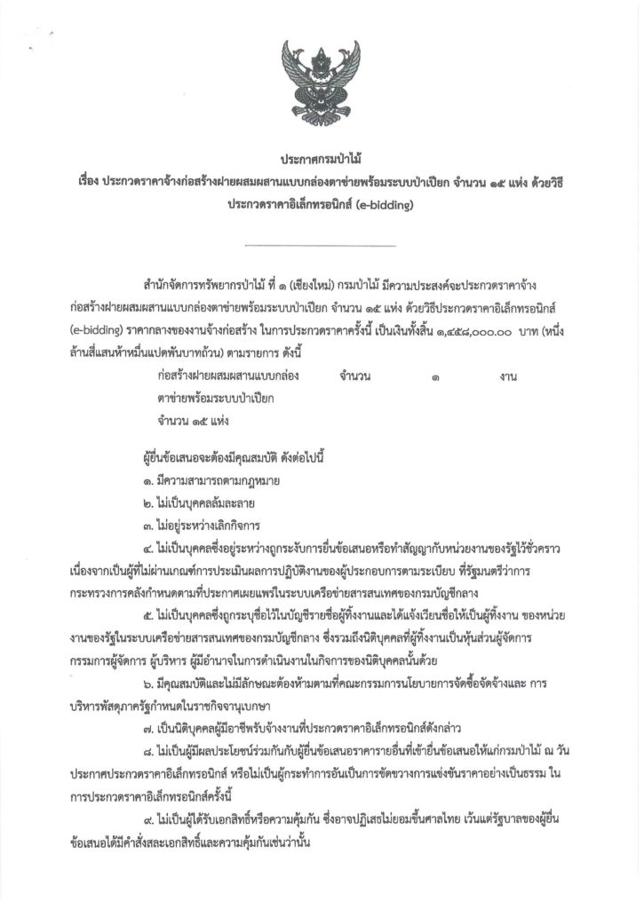 ประกาศกรมป่าไม้เรื่อง ประกวดราคาจ้างก่อสร้างฝ่ายผสมผสานแบบกล่องตาข่ายพร้อมระบบป่าเปียก จำนวน ๑๕ แห่ง ด้วยวิธีประกวดราคาอิเล็กทรอนิกส์ (e-bidding)28 สิงหาคม 2023 ใน ประกาศจัดซื้อจัดจ้าง by adminir