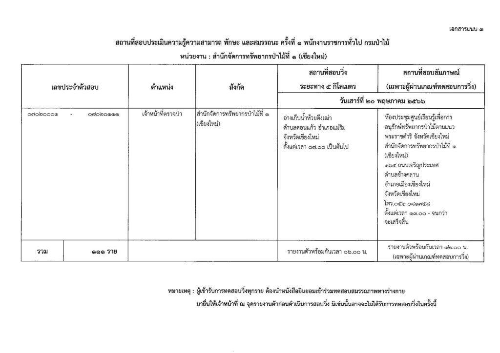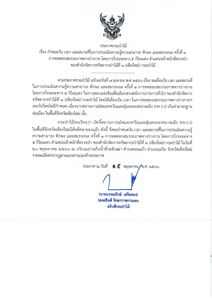 หน้าแรก » ประกาศ » ประกาศกรมป่าไม้ เรื่อง กำหนดวัน เวลา และสถานที่ในการประเมินความรู้ความสามารถ ทักษะ และสมรรถนะ ครั้งที่ ๑ การทดสอบสมรรถภาพทางร่างกาย โดยการวิ่งระยะทาง ๕ กิโลเมตร ตำแหน่งเจ้าหน้าที่ตรวจป่า ของ สำนักจัดการทรัพยากรป่าไม้ที่ ๑ (เชียงใหม่) กรมป่าไม้