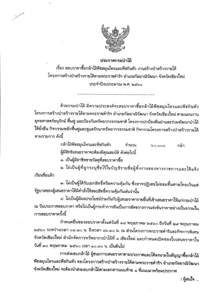 ประกาศกรมป่าไม้ เรื่อง สอบราคาซื้อกล้าไม้พืชสมุนไพรและพืชกินหัว งานสร้างป่าสร้างรายได้โครงการสร้างป่าสร้างรายได้ตามพระราชดำริฯ อำเภอกัลยาณิวัฒนา จังหวัดเชียงใหม่ ประจำปีงบประมาณ พ.ศ. ๒๕๖๐