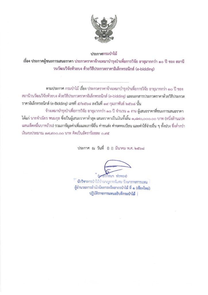 ประกาศกรมป่าไม้ เรื่อง ประกาศผู้ชนะการเสนอราคา ประกวดราคาจ้างเหมาบำรุงป่าเพื่อการวิจัย อายุมากกว่า ๑๐ ปี ของ สถานีวนวัฒนวิจัยห้วยบง ด้วยวิธีประกวดราคาอิเล็กทรอนิกส์ (e-bidding)13 มีนาคม 2025 ใน ประกาศจัดซื้อจัดจ้าง / ประกาศผู้ชนะการเสนอราคา by adminir