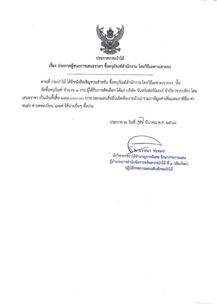 ประกาศกรมป่าไม้ เรื่อง ประกาศผู้ชนะการเสนอราคา ซื้อครุภัณฑ์สำนักงาน โดยวิธีเฉพาะเจาะจง17 มีนาคม 2025 ใน ประกาศจัดซื้อจัดจ้าง / ประกาศผู้ชนะการเสนอราคา by adminir