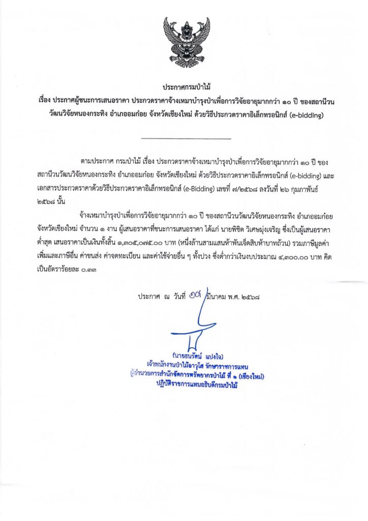 ประกาศกรมป่าไม้ เรื่อง ประกาศผู้ชนะการเสนอราคา ประกวดราคาจ้างเหมาบำรุงป่าเพื่อการวิจัยอายุมากกว่า ๑๐ ปี ของสถานีวนวิจัยหนองกระทิง อำเภออมก๋อย จังหวัดเชียงใหม่ ด้วยวิธีประกวดราคาอิเล็กทรอนิกส์ (e-bidding)18 มีนาคม 2025 ใน ประกาศจัดซื้อจัดจ้าง / ประกาศผู้ชนะการเสนอราคา by adminir