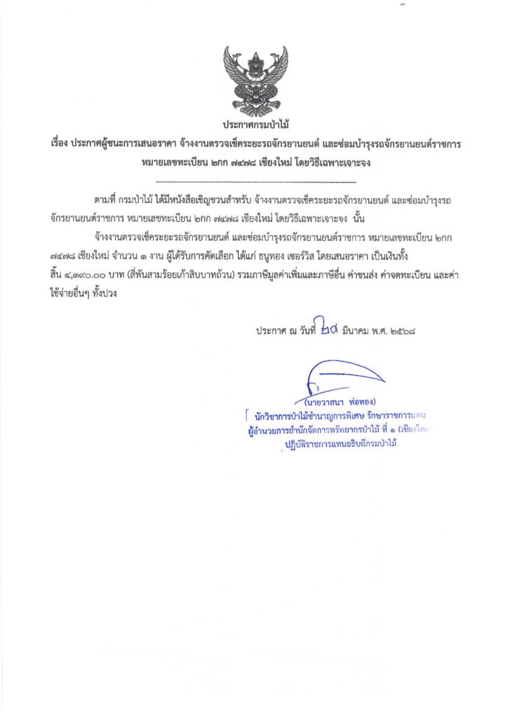 ประกาศกรมป่าไม้ เรื่อง ประกาศผู้ชนะการเสนอราคา จ้างงานตรวจเช็คระยะรถจักรยานยนต์ และซ่อมบำรุงรถจักรยานยนต์ราชการ หมายเลขทะเบียน ๒กก ๗๔๗๘ เชียงใหม่ โดยวิธีเฉพาะเจาะจง28 มีนาคม 2025 ใน ประกาศจัดซื้อจัดจ้าง / ประกาศผู้ชนะการเสนอราคา by adminir
