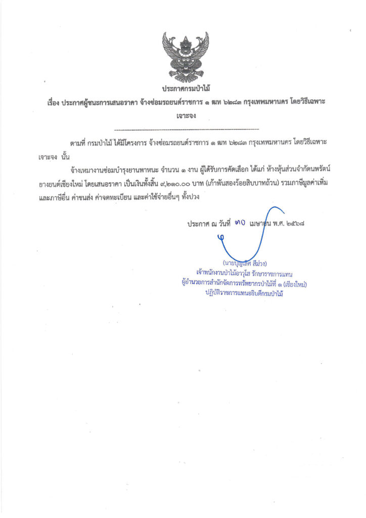 ประกาศกรมป่าไม้ เรื่อง ประกาศผู้ชนะการเสนอราคา จ้างซ่อมรถยนต์ราชการ ๑ ฒท ๖๒๘๓ กรุงเทพมหานคร โดยวิธีเฉพาะเจาะจง30 เมษายน 2025 ใน ประกาศจัดซื้อจัดจ้าง / ประกาศผู้ชนะการเสนอราคา by adminir