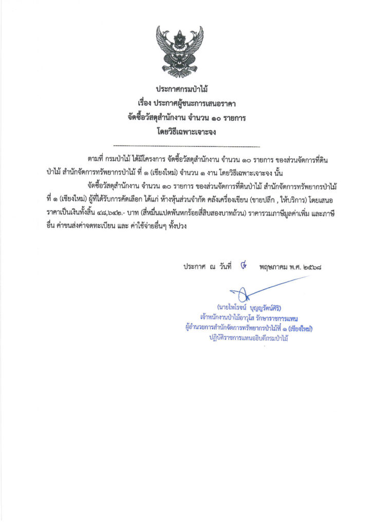 ประกาศกรมป่าไม้ เรื่อง ประกาศผู้ชนะการเสนอราคา จัดซื้อวัสดุสำนักงาน จำนวน ๑๐ รายการ โดยวิธีเฉพาะเจาะจง8 พฤษภาคม 2025 ใน ประกาศจัดซื้อจัดจ้าง / ประกาศผู้ชนะการเสนอราคา by adminir